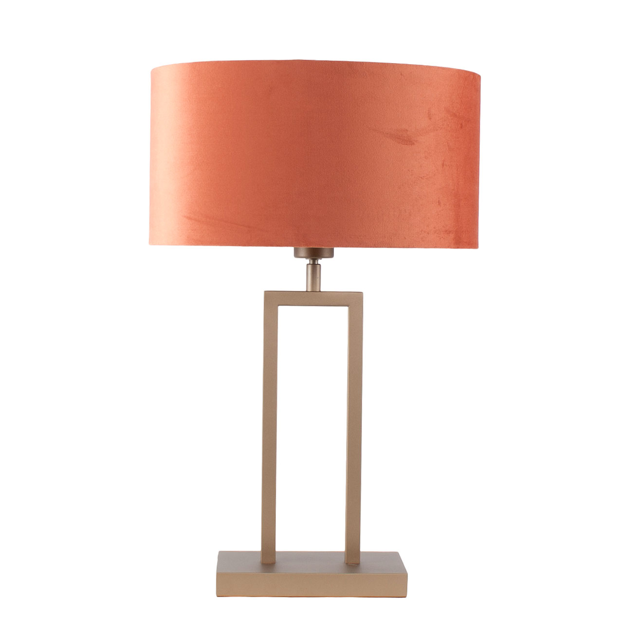 Met een totale hoogte van 55 cm, inclusief de kap, is deze tafellamp perfect geschikt voor gebruik op een nachtkastje, bijzettafel of bureau. De kap, met een breedte van 35 cm, een diepte van 23 cm, en een hoogte van 18 cm, straalt warmte uit met zijn diepe roestkleurige velours, terwijl de gouden binnenkant het licht prachtig weerkaatst voor een sfeervolle gloed.