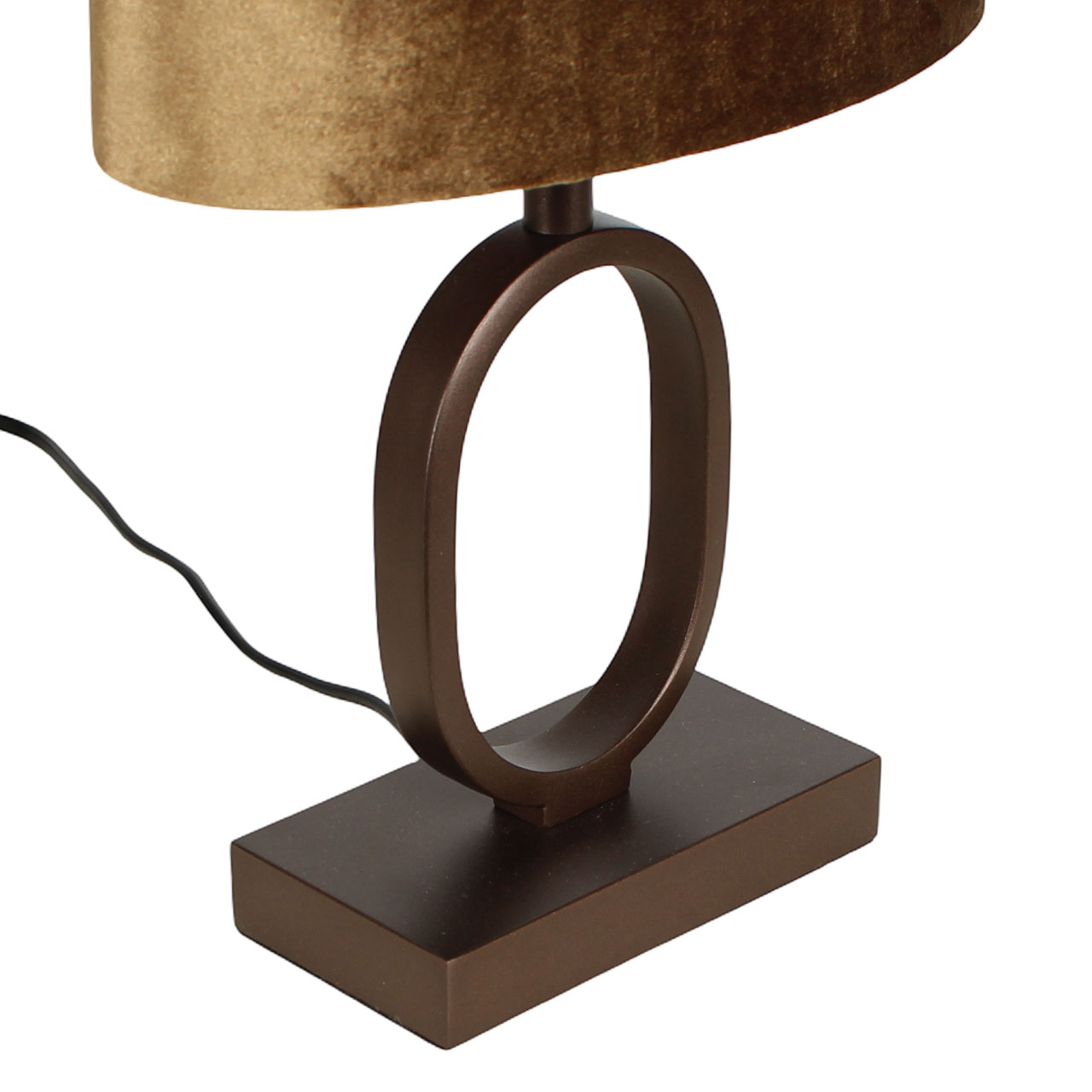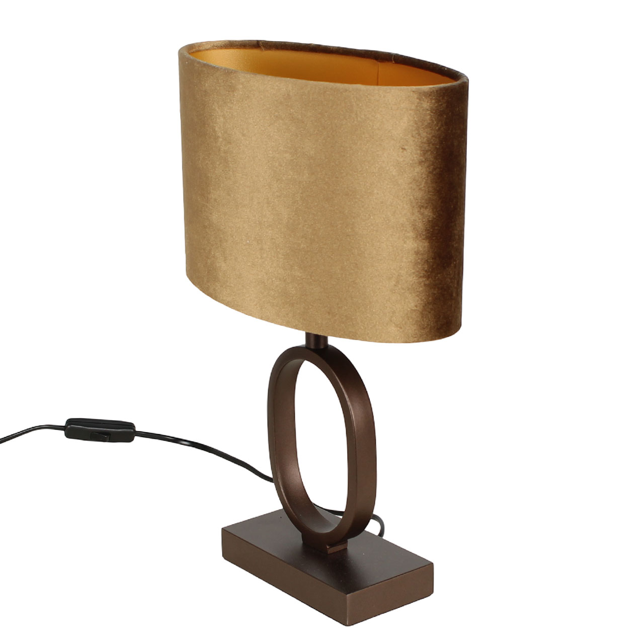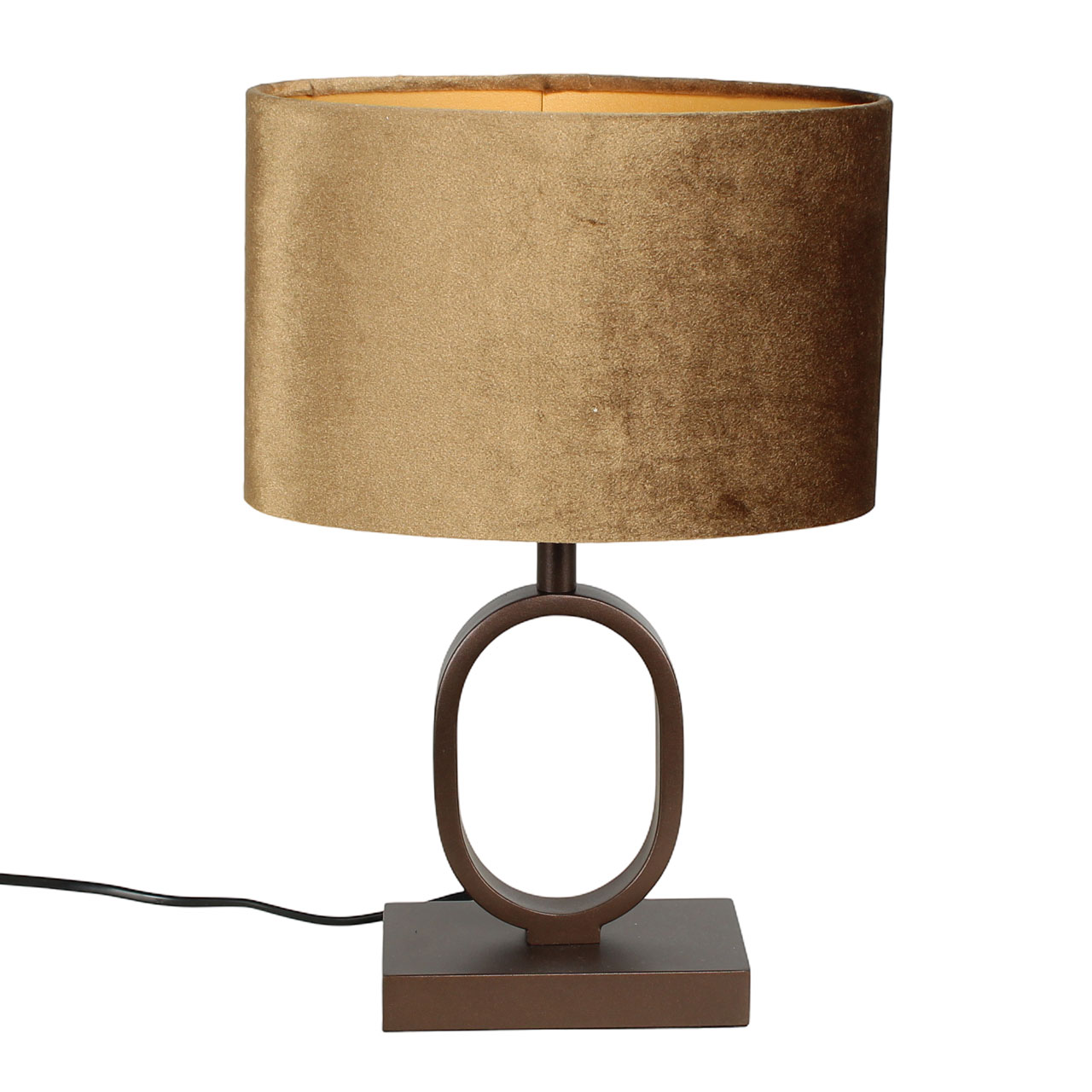 De lamp heeft een hoogte van 38 cm en is voorzien van een ovale kap van 25 cm breed, 13 cm diep en 16 cm hoog. Dankzij het compacte formaat is deze lamp ideaal voor een nachtkastje, een dressoir of bijzettafel. De diepe cacaokleurige voet vormt een warme basis, terwijl de velvet kap met gouden binnenkant zorgt voor een luxueuze lichtgloed.