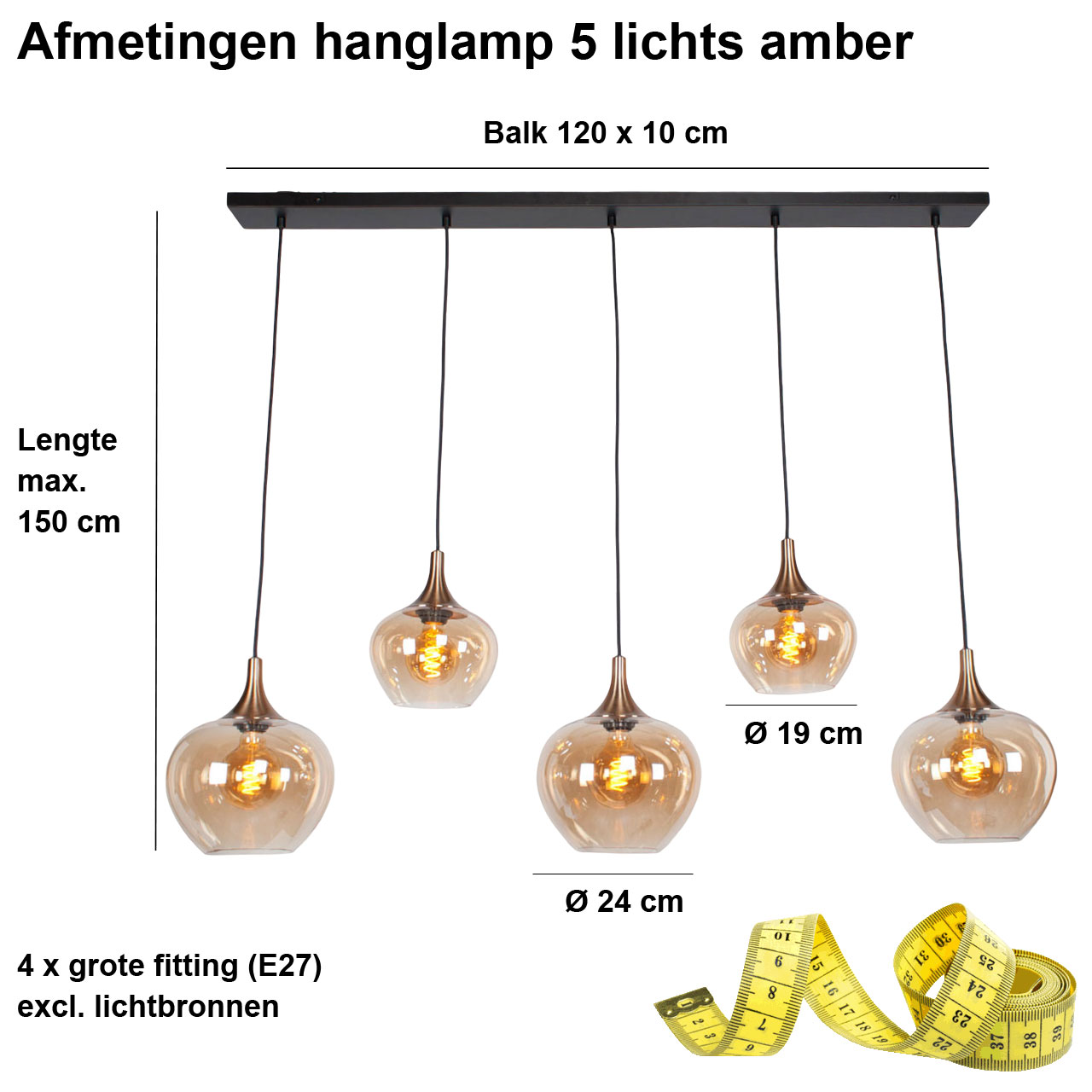 Deze hanglamp is voorzien van vijf amberkleurige glazen kappen, waarvan drie een diameter hebben van 24 cm en twee een diameter van 19 cm. Deze variatie in formaat creëert een speels en dynamisch effect dat direct de aandacht trekt. De glazen zijn bevestigd aan een rechthoekige plafondplaat van 120 x 10 cm in matzwart metaal, wat zorgt voor een strakke en moderne afwerking.