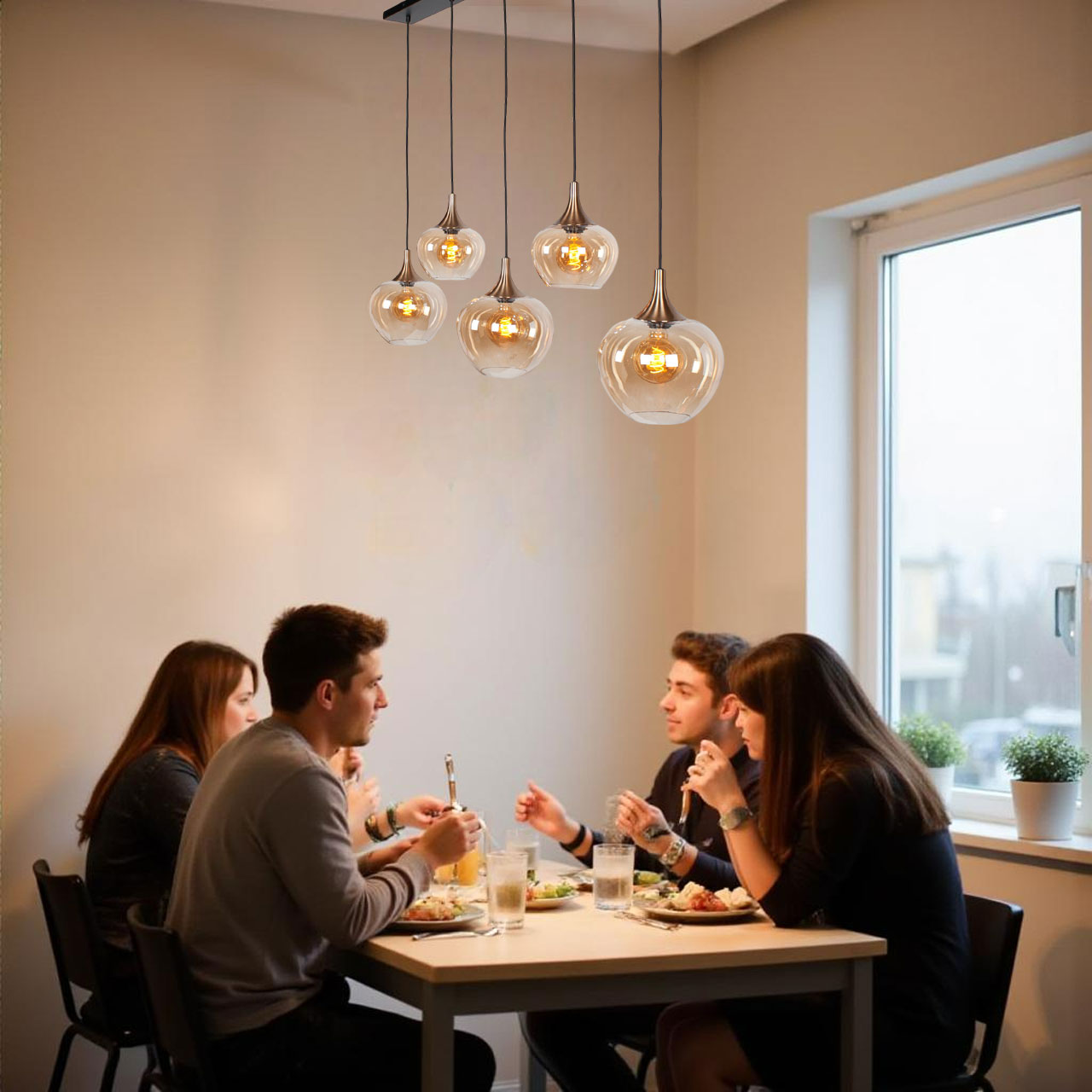 Chique 5-lichts glazen eettafellamp met amber glas