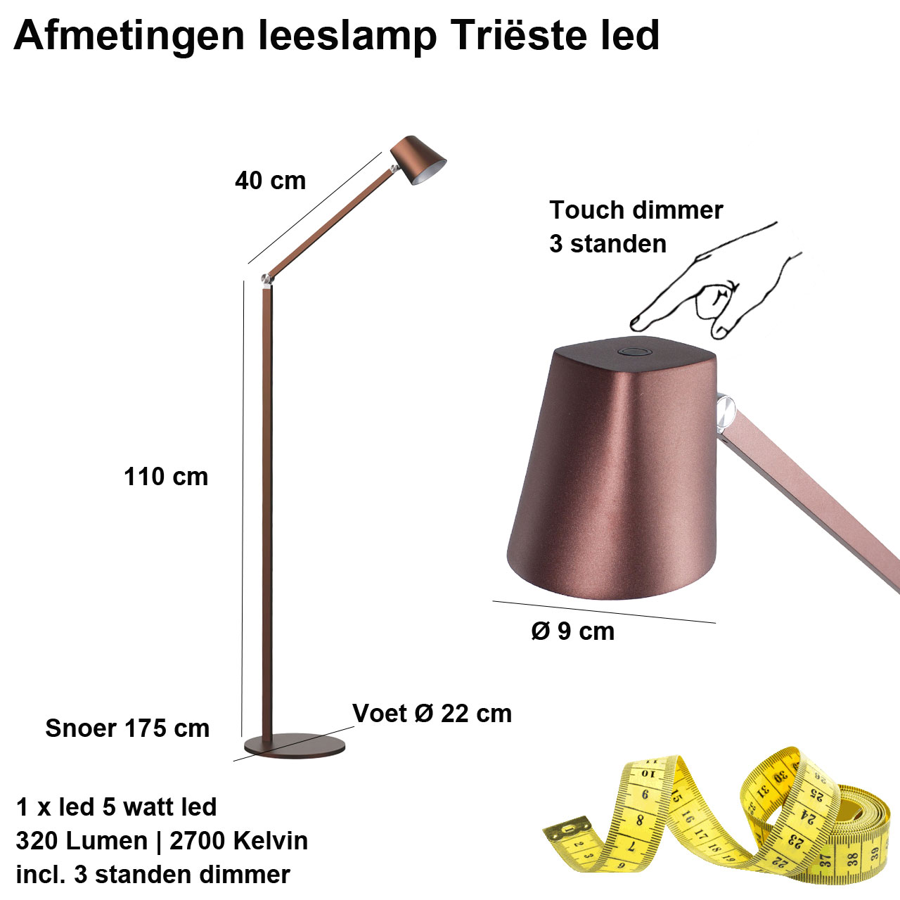 - Dimbaar: ja, via touchknop bovenop de lampkop (3 standen)