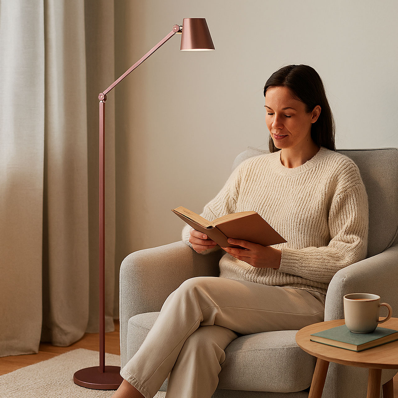 De Triëste vloerlamp in koperkleur is een stijlvolle en functionele leeslamp met een elegante afwerking. Dankzij de matte, licht sprankelende koperkleur met bordeauxrode ondertoon voegt deze vloerlamp een warm accent toe aan moderne en klassieke interieurs. De lamp is ontworpen voor gericht leeslicht en praktisch gebruik, zonder in te leveren op design.