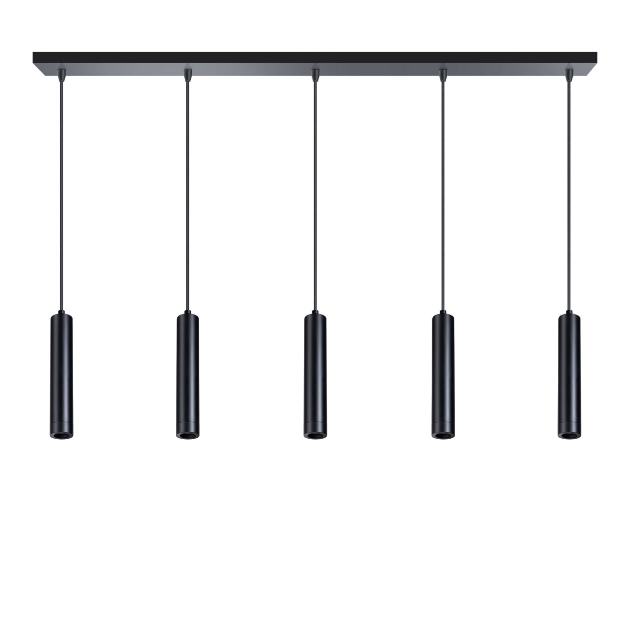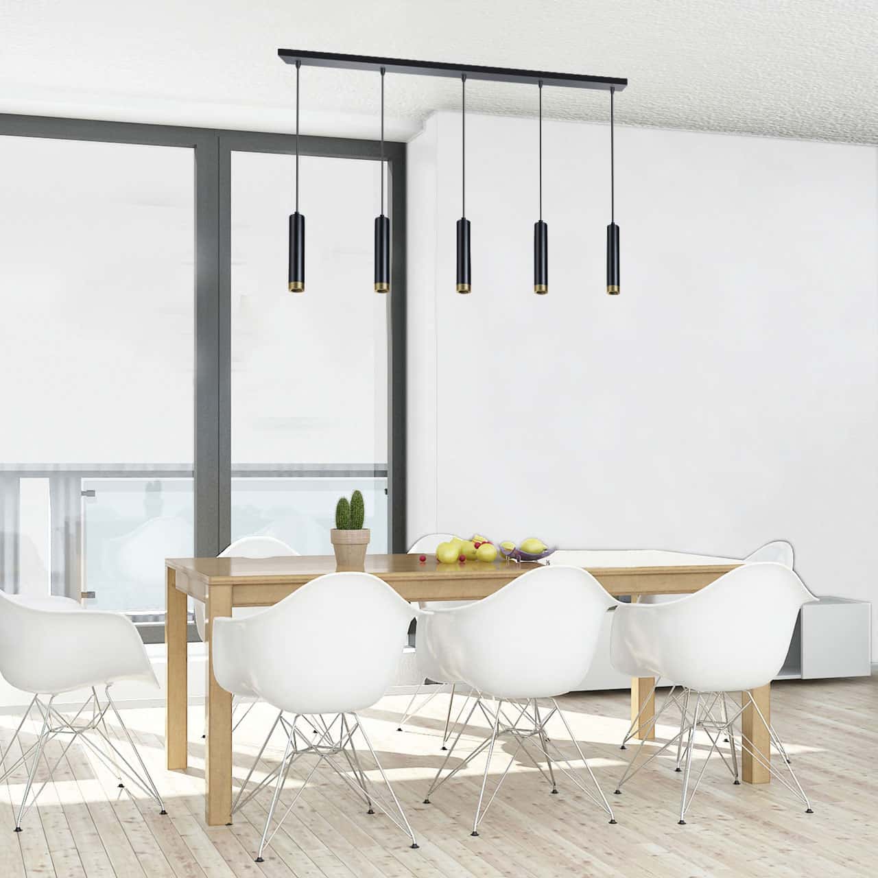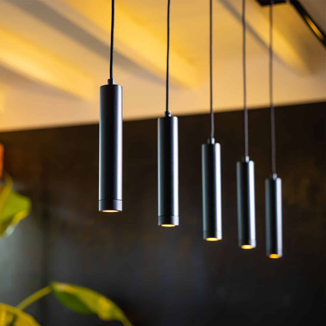 Deze moderne hanglamp is een combinatie tussen stijl, functionaliteit en keuze. De lamp heeft een modern uiterlijk door het zwarte armatuur. Aan het uiteinde van elke spot kan zowel een zwarte als een goudkleurige ring worden geplaatst. Van beide kleuren worden vijf ringen meegeleverd, dus je kan na verloop van tijd de ringen weer omwisselen. Ook heb je nog de mogelijkheid om de ringen weg te laten en te kiezen voor decoratieve ledlampen. De lampen zijn onafhankelijk in hoogte te verstellen bij de montage tot 200 cm.