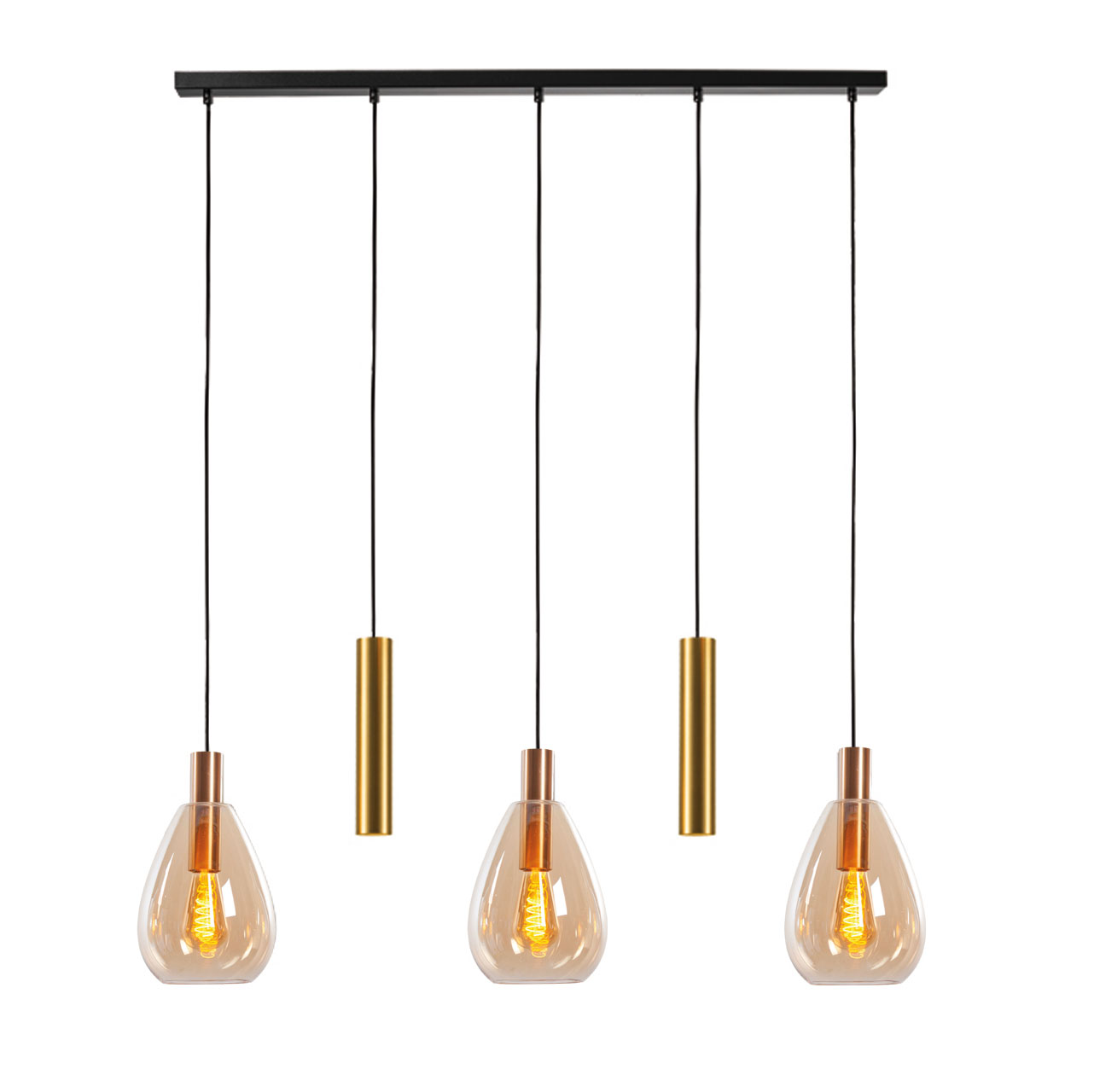 Deze hanglamp beschikt over drie amberkleurige glazen (met E27-fitting) en twee goudkleurige kokers voor GU10-lampen. Beide elementen zijn individueel in hoogte verstelbaar. Hierdoor kun je het licht eenvoudig aanpassen aan jouw voorkeuren. Dit biedt zowel sfeervolle als functionele verlichting.