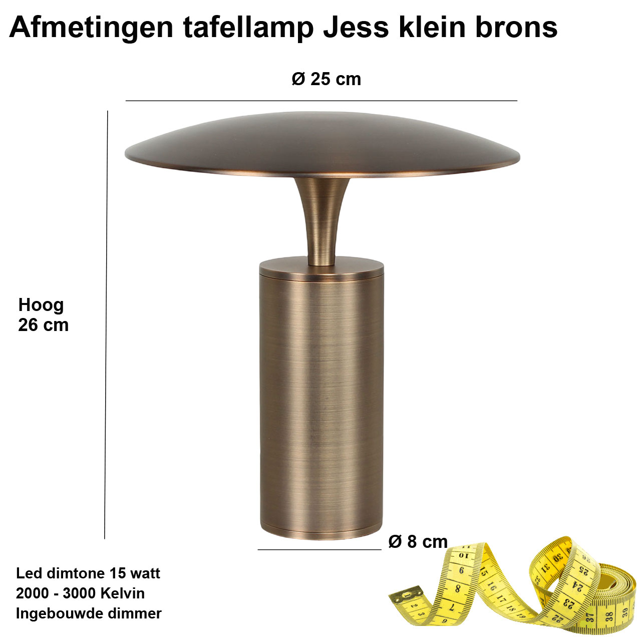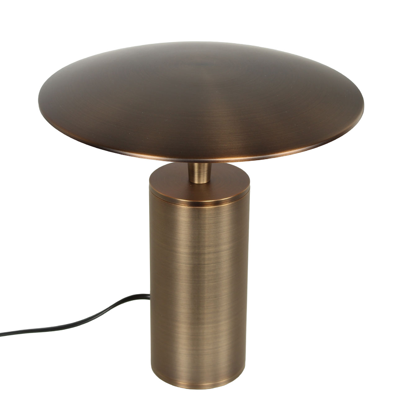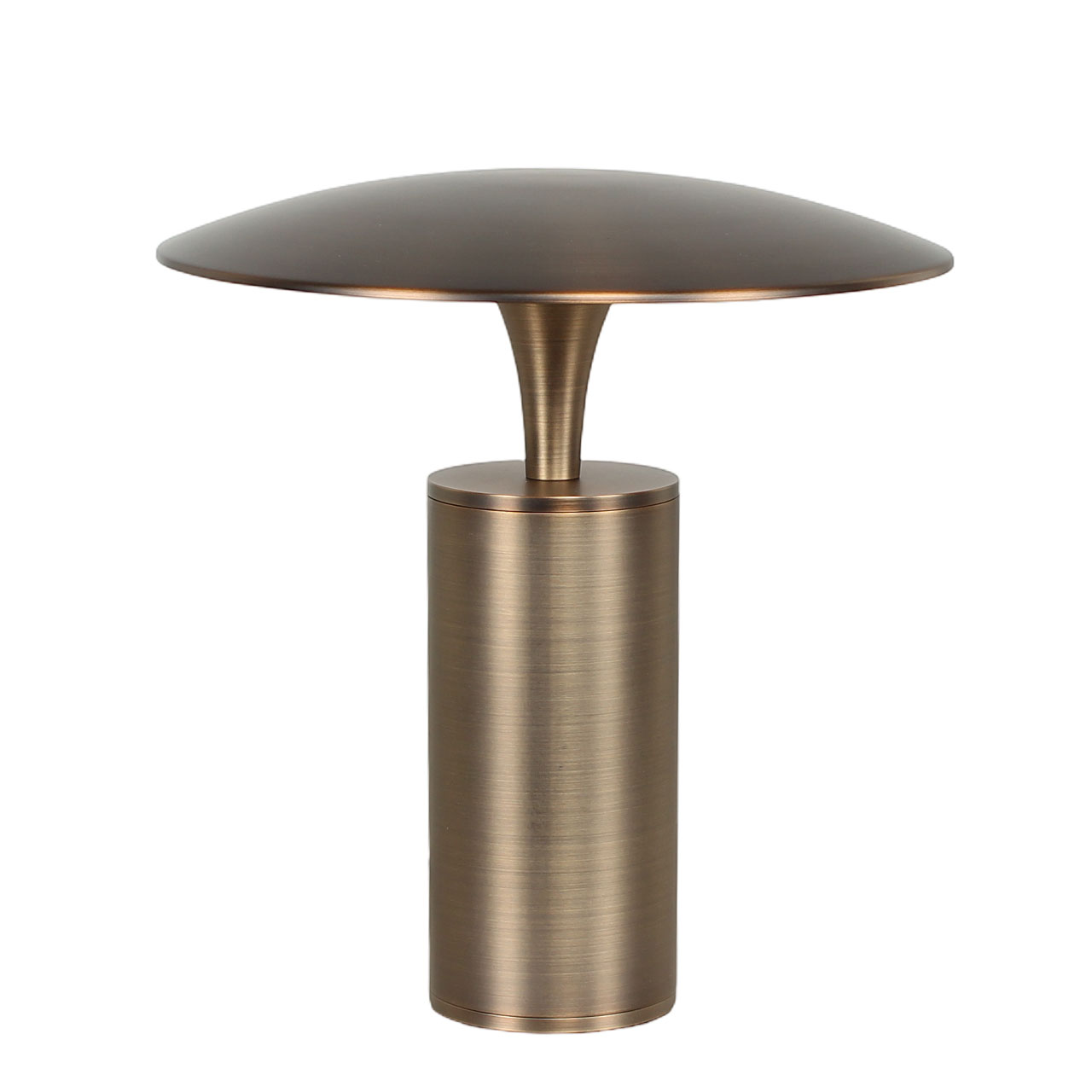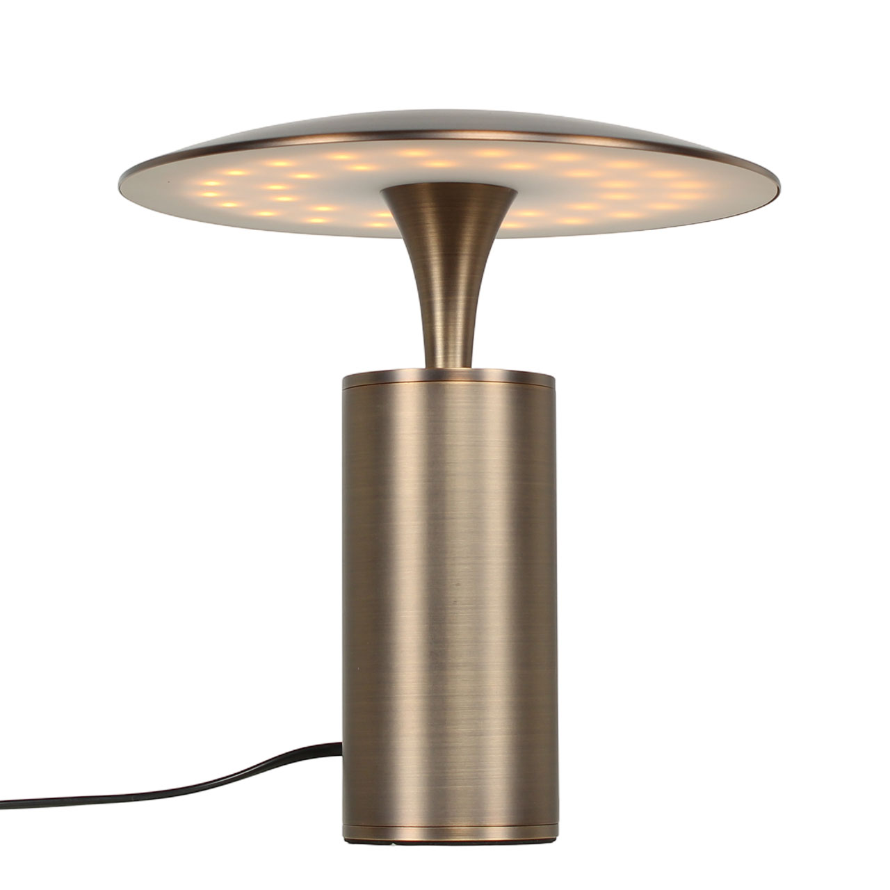 Met zijn ronde, schijfvormige kap en slanke voet straalt deze tafellamp pure elegantie uit. De warme bronskleur zorgt voor een luxe gevoel dat past bij elk interieurtype – van Scandinavisch minimalisme tot hotel chique.