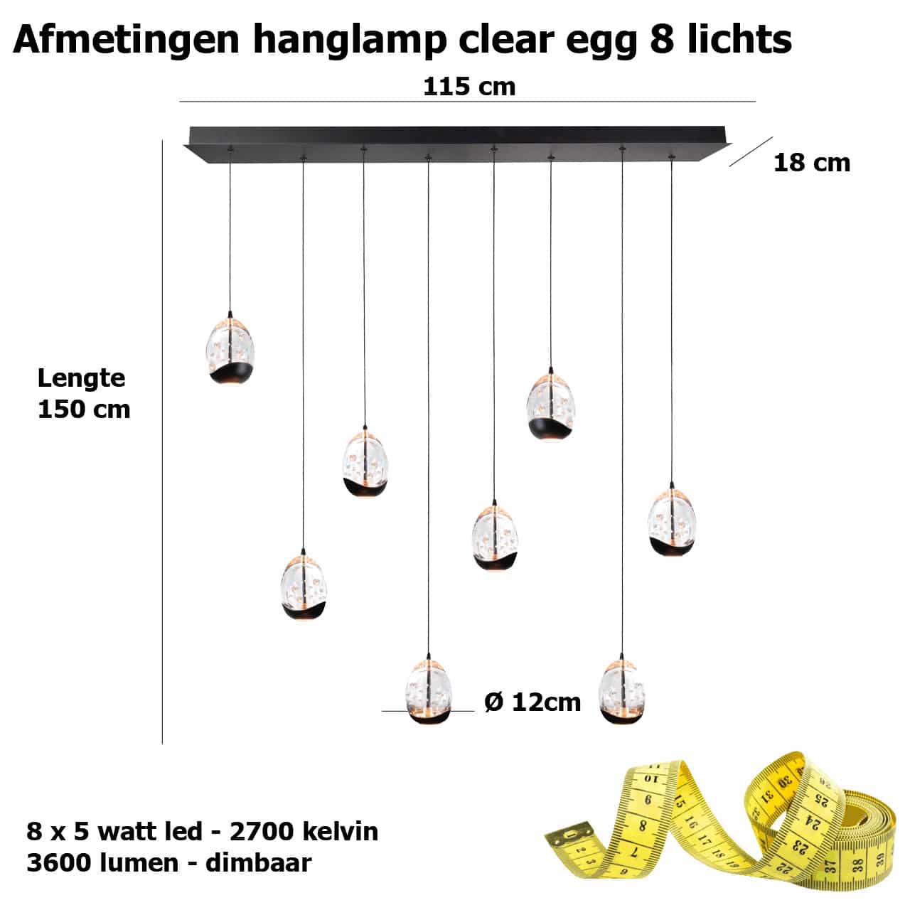 Sierlijke 8-lichts hanglamp met rechthoekige zwarte plafondplaat, behorend tot de serie Clear Egg. Als je een echte eyecatcher in jouw huis wil hebben, dan is deze hanglamp daar een goede optie voor. Het ”ei” bestaat uit massief glas met daarin luchtbelletjes. In het midden zit een zwart staafje naar de LED’s toe. Het licht wordt daardoor vanaf de onderkant het glas in geschenen. Ook zijn er LED’s naar beneden gericht, waardoor deze lamp zowel direct als indirect licht geeft. Dat is ideaal voor boven de eettafel! Aan de onderkant van het glas zit een zwarte metalen rand. De plafondbevestiging (115 x 18 cm) is mat zwart. In elke glazen bol (Ø 9,5 cm) zit 5 Watt LED. Door de luchtbelletjes en de plaatsing van de led’s ontstaat een mooie lichtverspreiding.