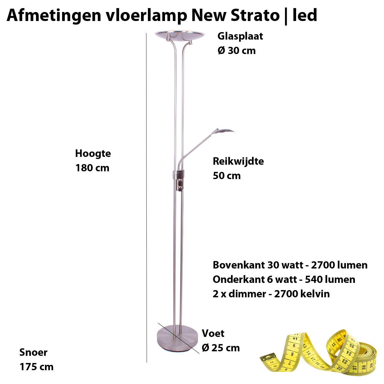 30 watt led 2700 Lumen en leesgedeelte – 6 watt led 540 Lumen. 2700 kelvin en twee ingebouwde dimmers. twee jaar garantie.