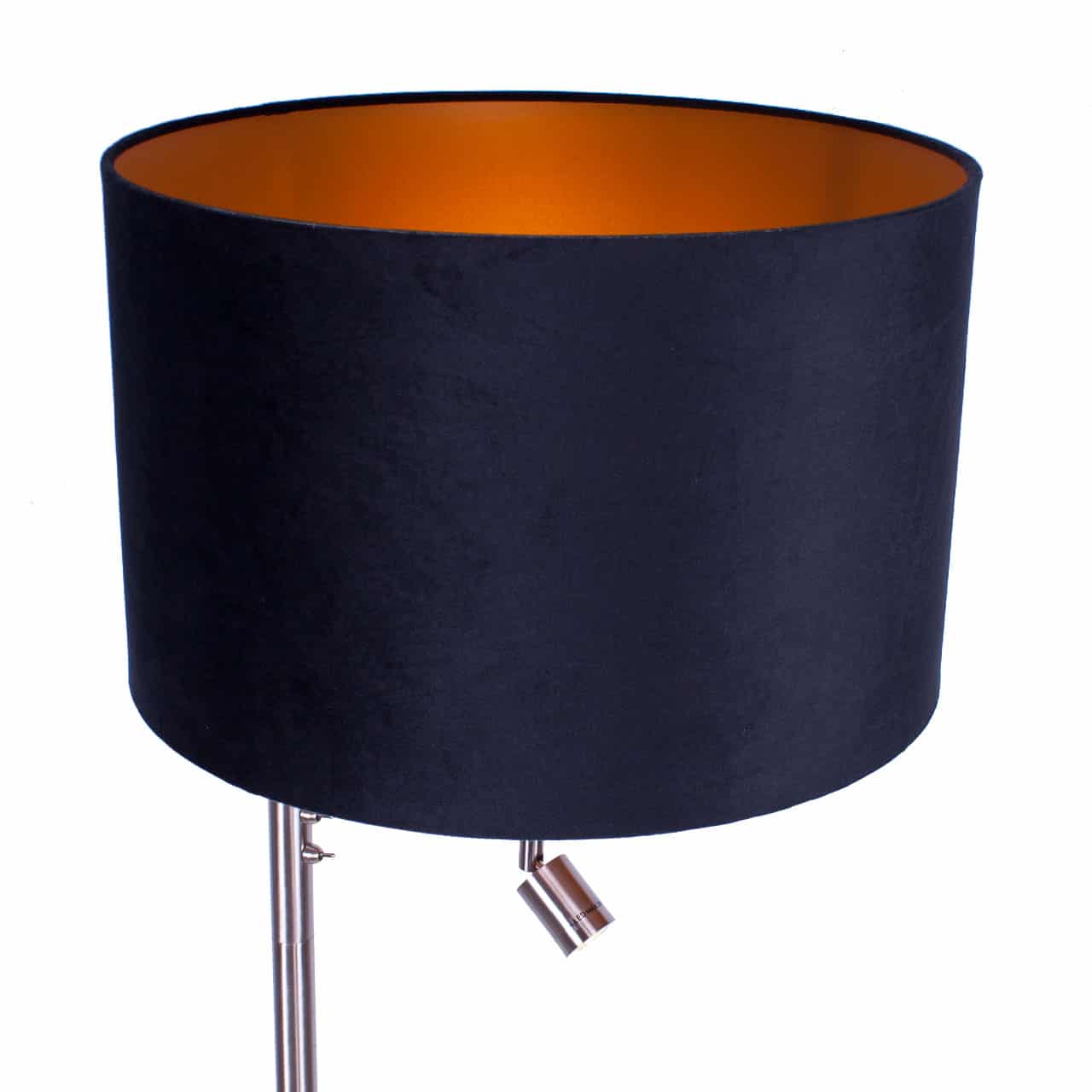 Hou je wel van een klassieke touch in je interieur? Dan is deze mat stalen vloerlamp met kap écht iets voor jou! Een praktische en decoratieve vloerlamp in één. Deze moderne vloerlamp is uitgerust met een zwarte velours kap met gouden binnenkant. Dit zorgt voor een prachtig lichteffect. Op het armatuur zitten twee aan- en uitschakelaars zodat je beide lampen apart kunt bedienen. Sfeer creëer je met de kap en lezen kun je makkelijk met de led spot, welke direct onder de kap zit.