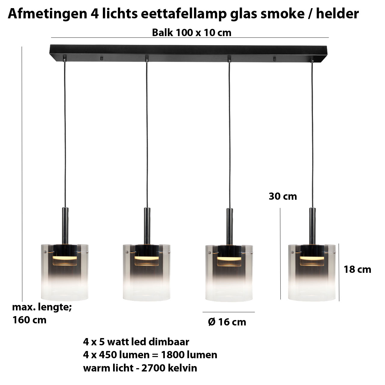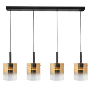Moderne 4 lichts hanglamp met rechthoekige plafondbevestiging, behorend tot de serie Salerno. Een leuke, maar ook zeer stijlvolle hanglamp voor boven je eettafel of voor in de woonkamer. De plafondbevestiging (100 cm x 10 cm) is mat zwart, met vier transparante snoeren. De draden zijn in lengte verstelbaar, maximale lengte is 160 cm. In de glazen kappen zit 4 x 5W LED. Door de combinatie van het zwarte en transparante glas heb je naast sfeervol zijwaarts licht, dus ook goed licht naar beneden.