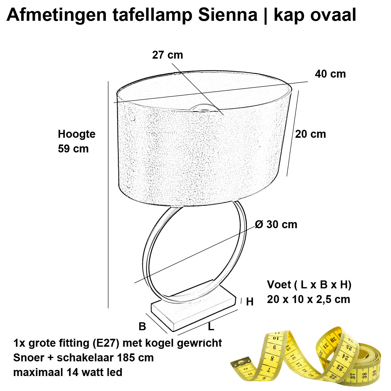 Deze moderne zwarte tafellamp is een verfijnde mix van eigentijds design en luxe materialen. Met een totale hoogte van 59 cm en een opvallende ovale kap van 40 cm breed, 27 cm diep, en 20 cm hoog, voegt deze lamp een stijlvol en uniek element toe aan je interieur. De tafellamp is ideaal voor gebruik in de woonkamer, slaapkamer, of op een dressoir, waar hij zowel elegantie als sfeer toevoegt.