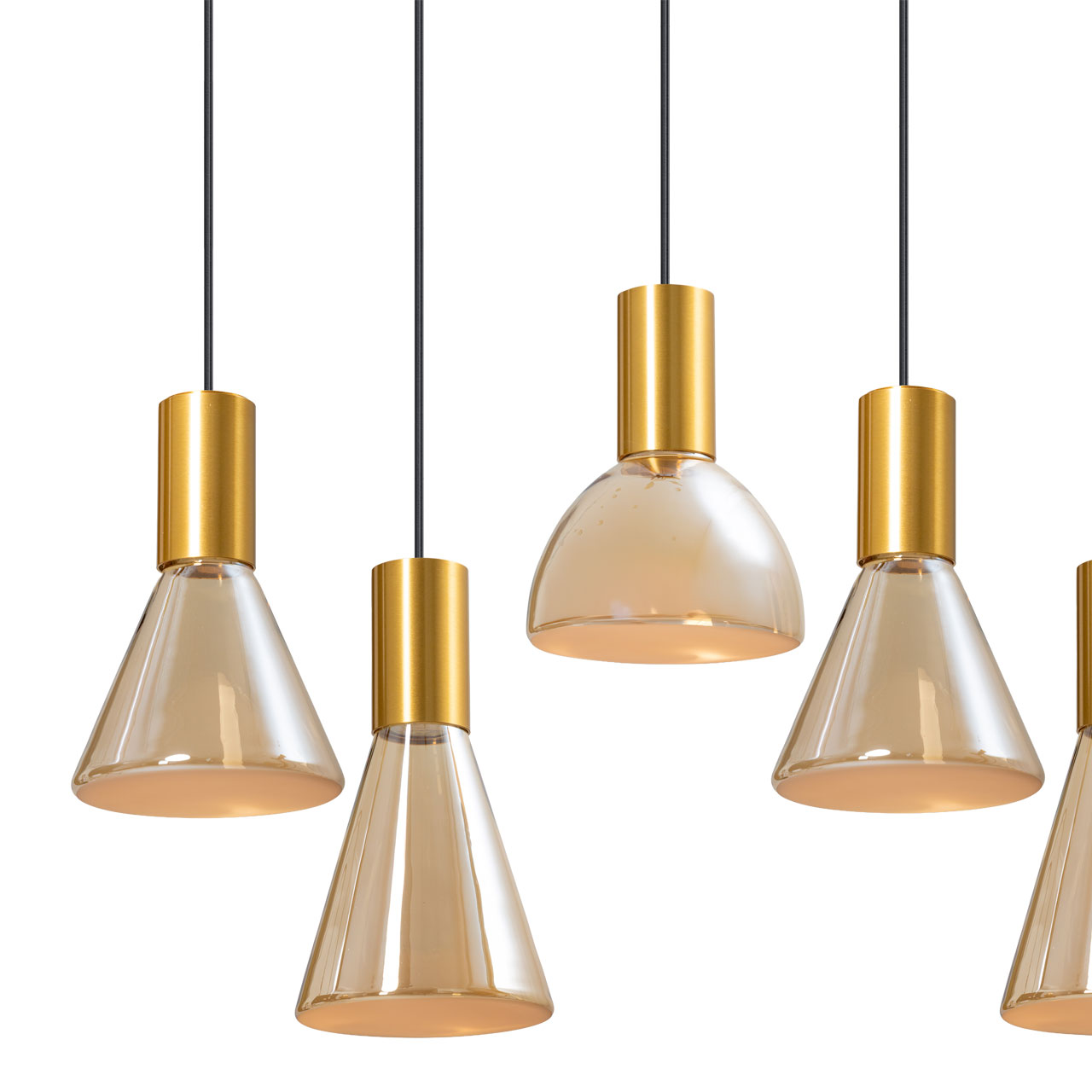 De variatie in glasvormen maakt deze hanglamp tot een echte eyecatcher. De drie verschillende modellen glazen zijn gemaakt van amberkleurig glas en hangen aan een bronskleurige pendel, die overloopt in een zwart snoer. Elk snoer is afzonderlijk in hoogte verstelbaar tot maximaal 300 cm, waardoor je volledige controle hebt over de compositie van de lamp.