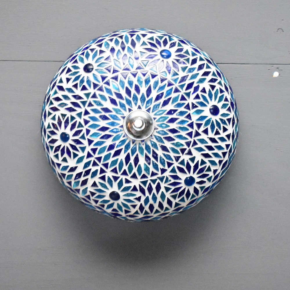 Heb jij al van de oosterse trend gehoord? Dit is de trend van dit moment! Plaats deze eye-catcher op een plek waar nog wel wat sfeer toegevoegd kan worden. Deze lamp heeft mozaïek van blauw glas, wat een luxe oosters tintje aan uw interieur geeft. De zonnetjes in de mozaïek is het kenmerk van het traditionele Turkish design. In deze plafondlamp zitten twee kleine (E14) fittingen voor een perfecte spreiding van het licht. Wist je dat je deze lampen perfect kan combineren met allerlei oosterse lampen met verschillende vormen, maten en kleur? Neem een kijkje onderaan de pagina voor meer inspiratie.