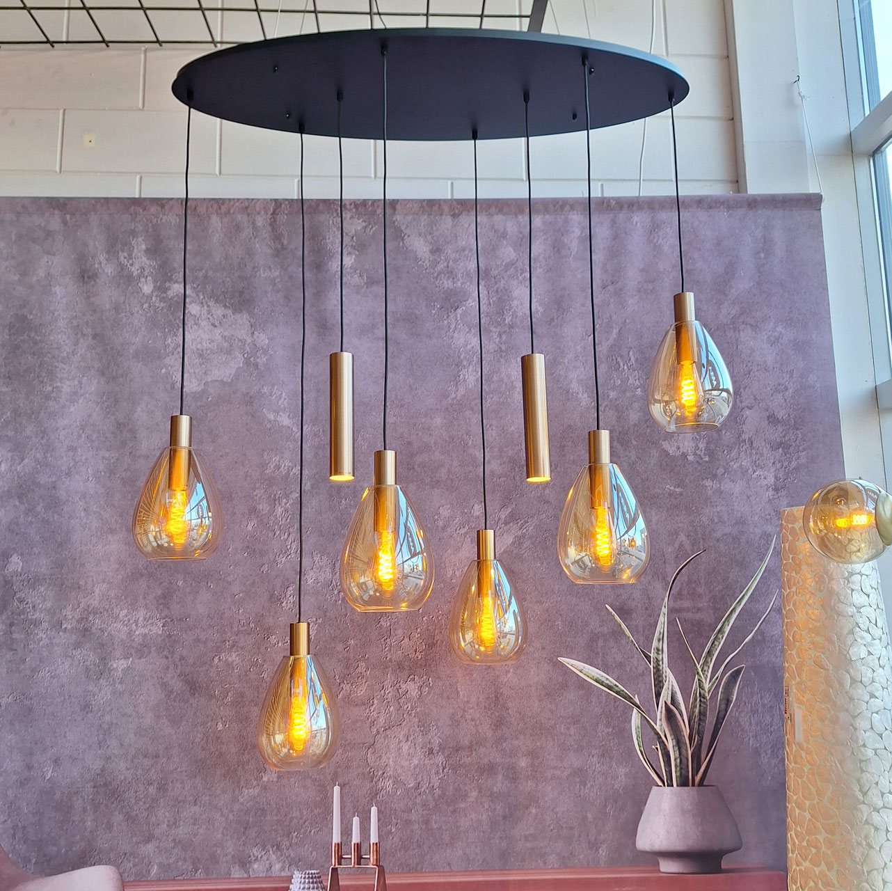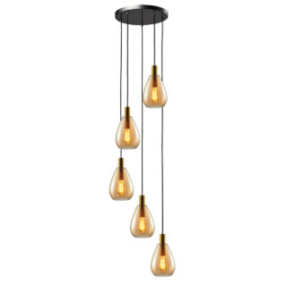 - De lamp combineert decoratief en functioneel licht door de mix van amberkleurige glazen en GU10-kokers.