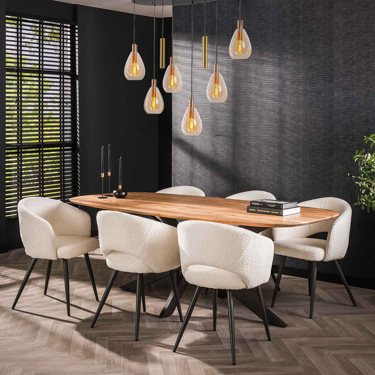 - De ovale plafondplaat zorgt voor een uitgebalanceerde verdeling van de lampen, waardoor het licht mooi over de eettafel wordt verspreid.