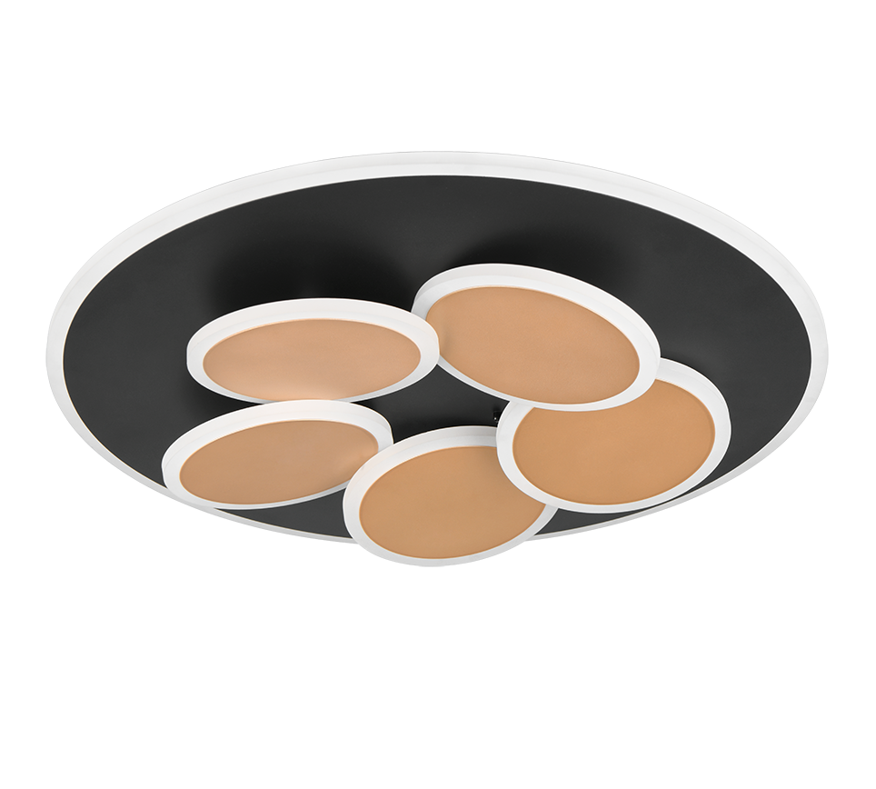 Deze moderne plafondlamp combineert een opvallend cirkelontwerp met een luxe zwart-gouden afwerking en krachtig, sfeervol licht. Dankzij de geïntegreerde LED, dimfunctie, instelbare lichtkleur van 2700 tot 6500K en handige extra’s zoals een nachtlamp-, timer- en geheugenfunctie past hij perfect in de woon- of slaapkamer.