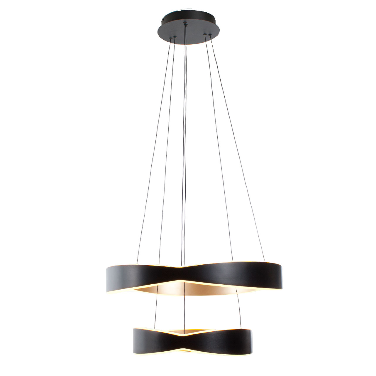 De Onda 2-lichts hanglamp is een elegante designlamp met twee speels gevormde LED-ringen die onafhankelijk in hoogte verstelbaar zijn. De luxe zwart-gouden afwerking en krachtige dimbare LED-verlichting (72W, 2700K, 6480 Lumen) zorgen voor een warme en stijlvolle ambiance. Met een plafondbevestiging van Ø 23 cm en ringen van Ø 60 cm en Ø 35 cm is deze lamp perfect als eyecatcher in elk modern interieur.