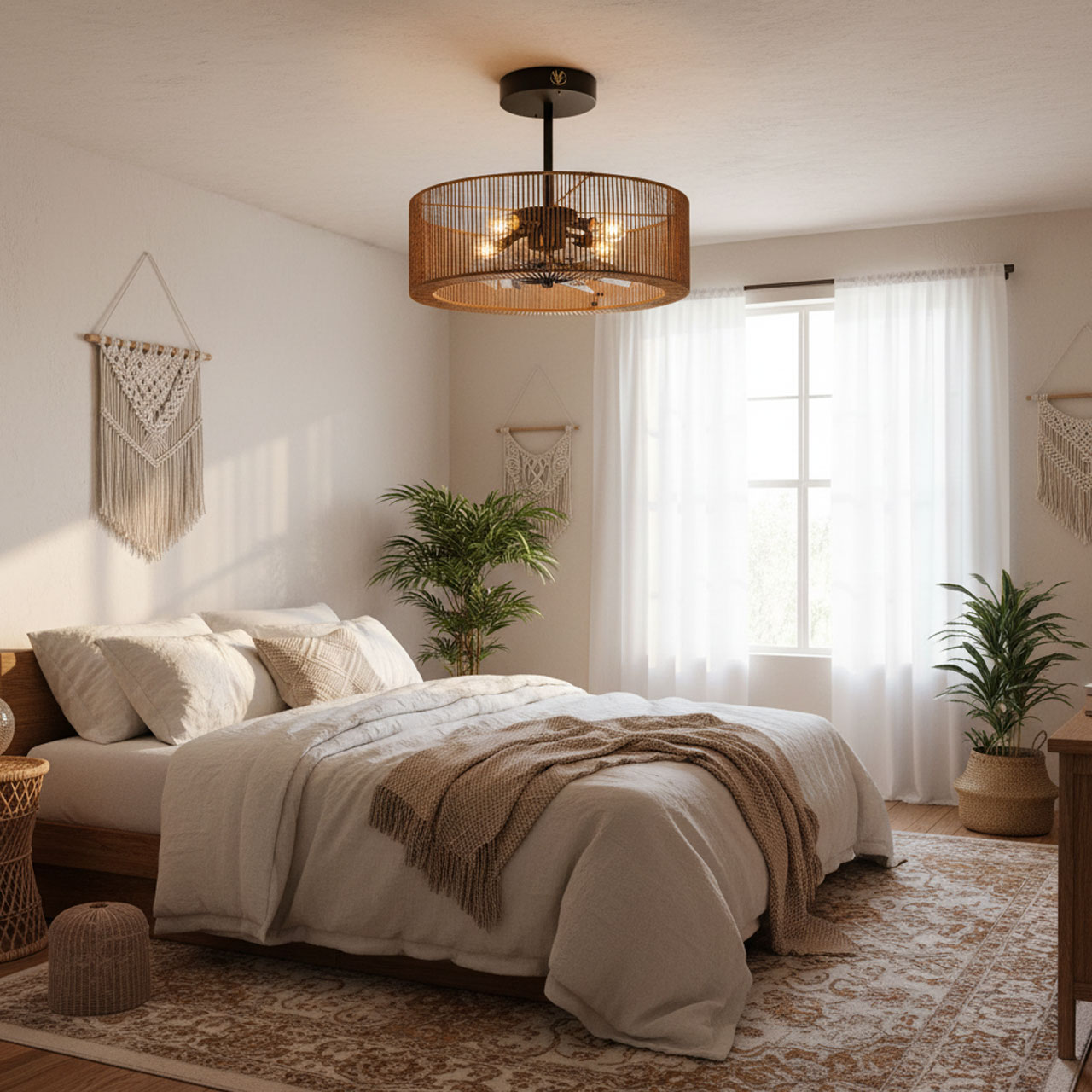 De Smillum plafondventilator combineert sfeervolle verlichting met een stijlvolle ventilator in boho uitstraling. Dankzij het zwarte metalen frame en de natuurlijke hennep kap haal je direct warmte en karakter in huis.
