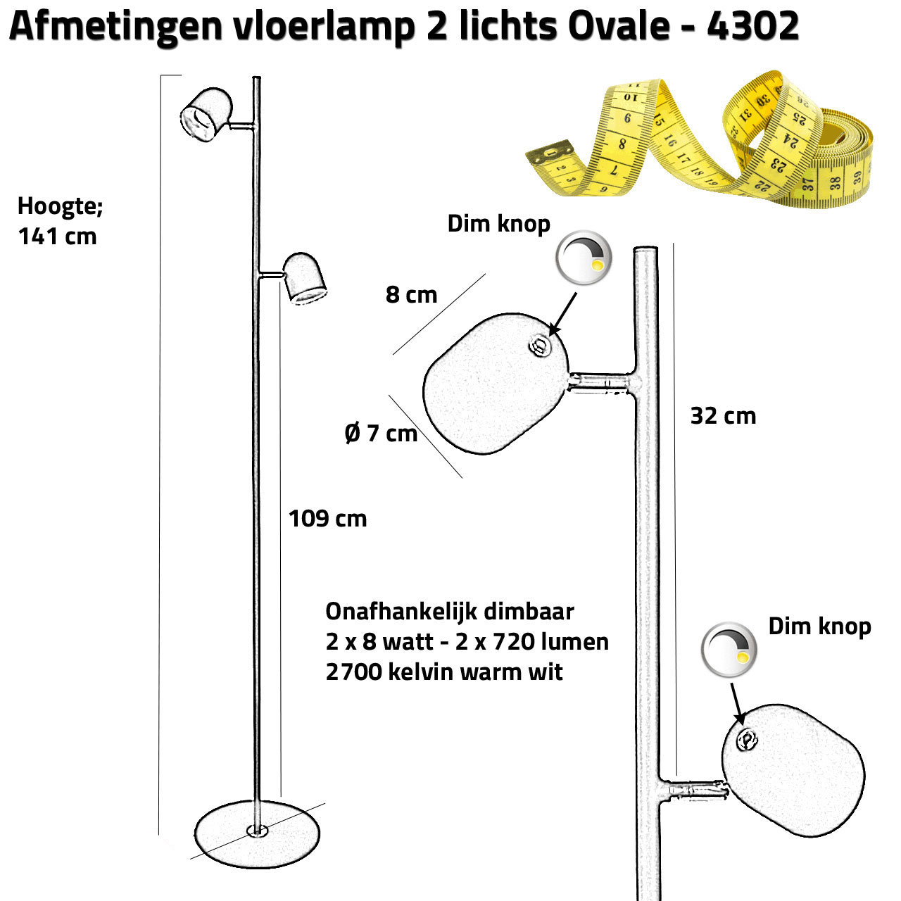 - Dimbaar: ja, beide lichtpunten zijn afzonderlijk traploos dimbaar