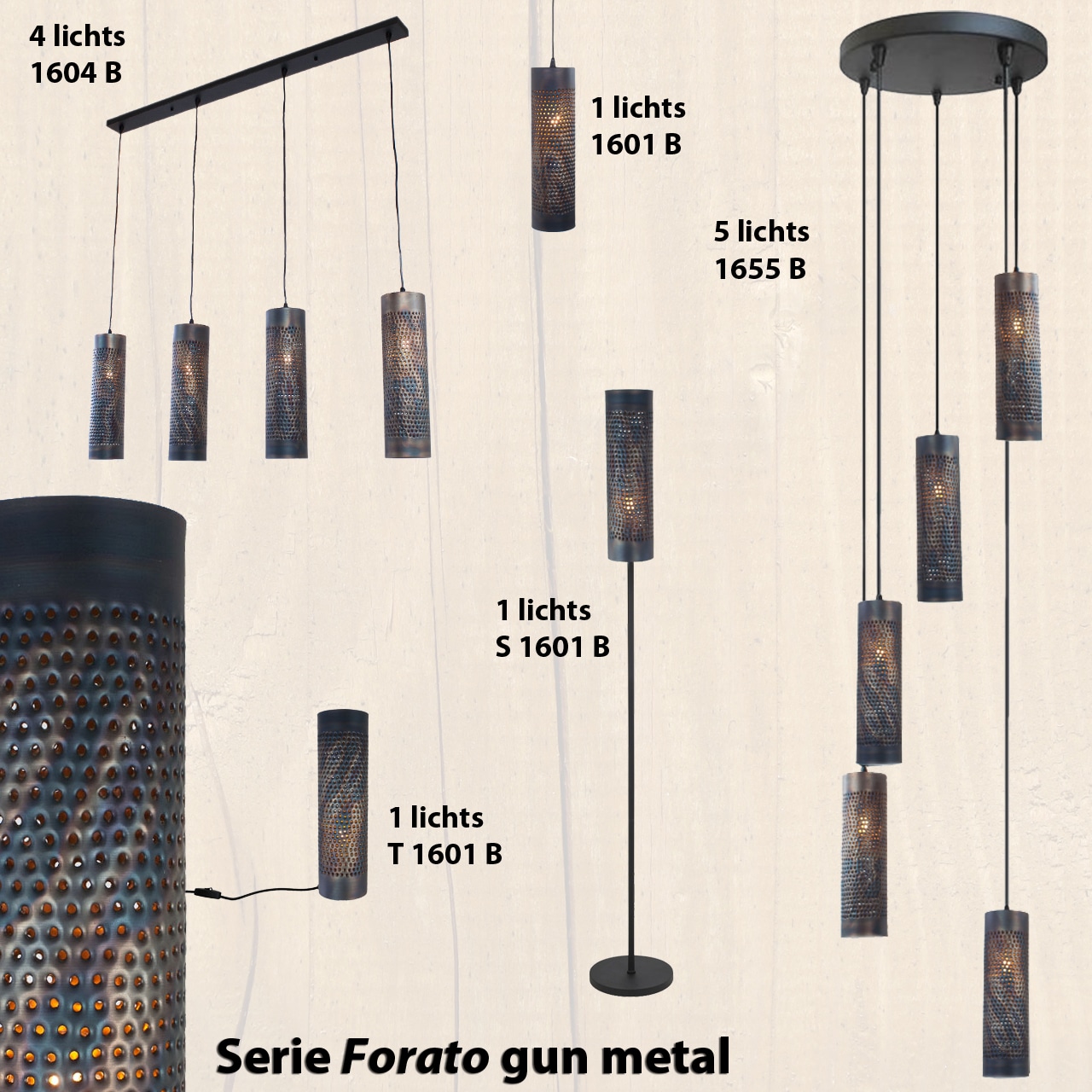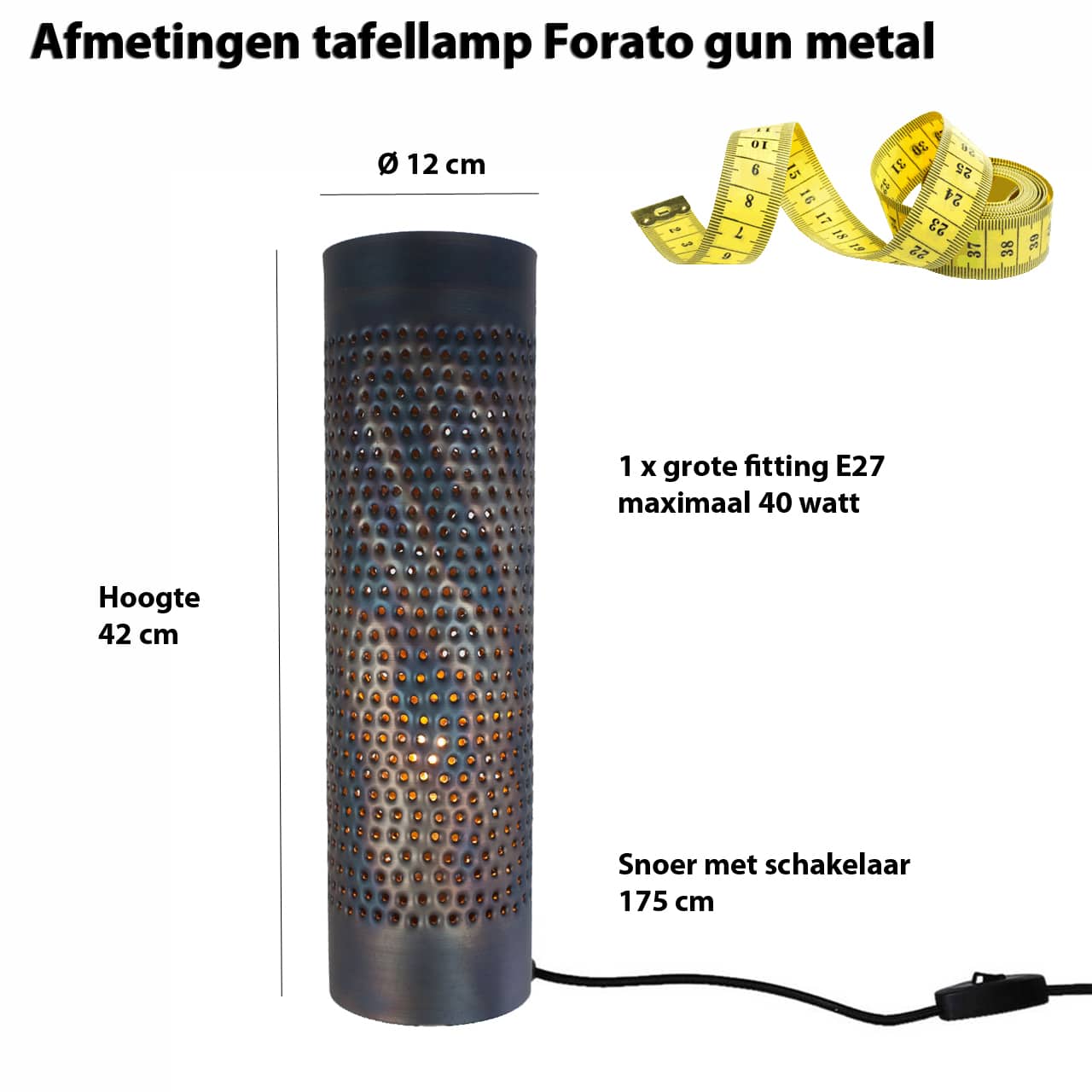 Zwarte / bruine tafellamp, behorend tot de serie Forato / Fori / Punch lampen. Deze cilinder vormige lamp heeft een sfeervolle lichtspreiding. De gaatjes zorgen ervoor dat de lamp ook wat zijwaarts licht geeft. Afhankelijk van de gebruikte lichtbron kun je kiezen tussen sfeer en functioneel licht. De binnenkant van deze tafellamp is goud / brons waardoor het licht een warme uitstraling heeft. Deze langwerpige komt goed tot z’n recht op een dressoir of klein tafeltje. Het snoer heeft een lengte van 175 cm. De lamp heeft 1 grote fitting, maximaal belastbaar tot 40 watt.