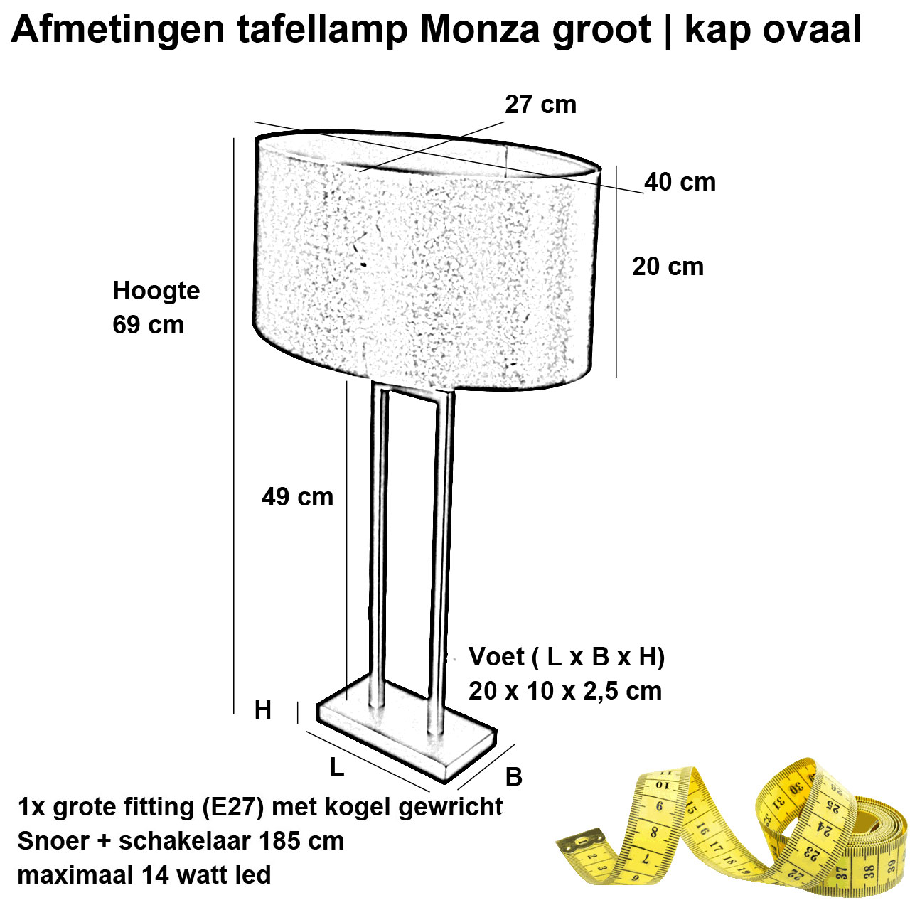 De kap heeft bovendien een breedte van 40 cm, een diepte van 27 cm, en een hoogte van 20 cm. Deze ruime kap zorgt dan ook voor een elegante uitstraling. De aardetinten creëren een warme en serene sfeer, wat ideaal is voor elke interieurstijl. Net als de kleinere versie heeft deze Monza tafellamp een E27 grote fitting. Daardoor is hij geschikt voor verschillende lichtbronnen, wat je veel flexibiliteit in verlichting biedt.
