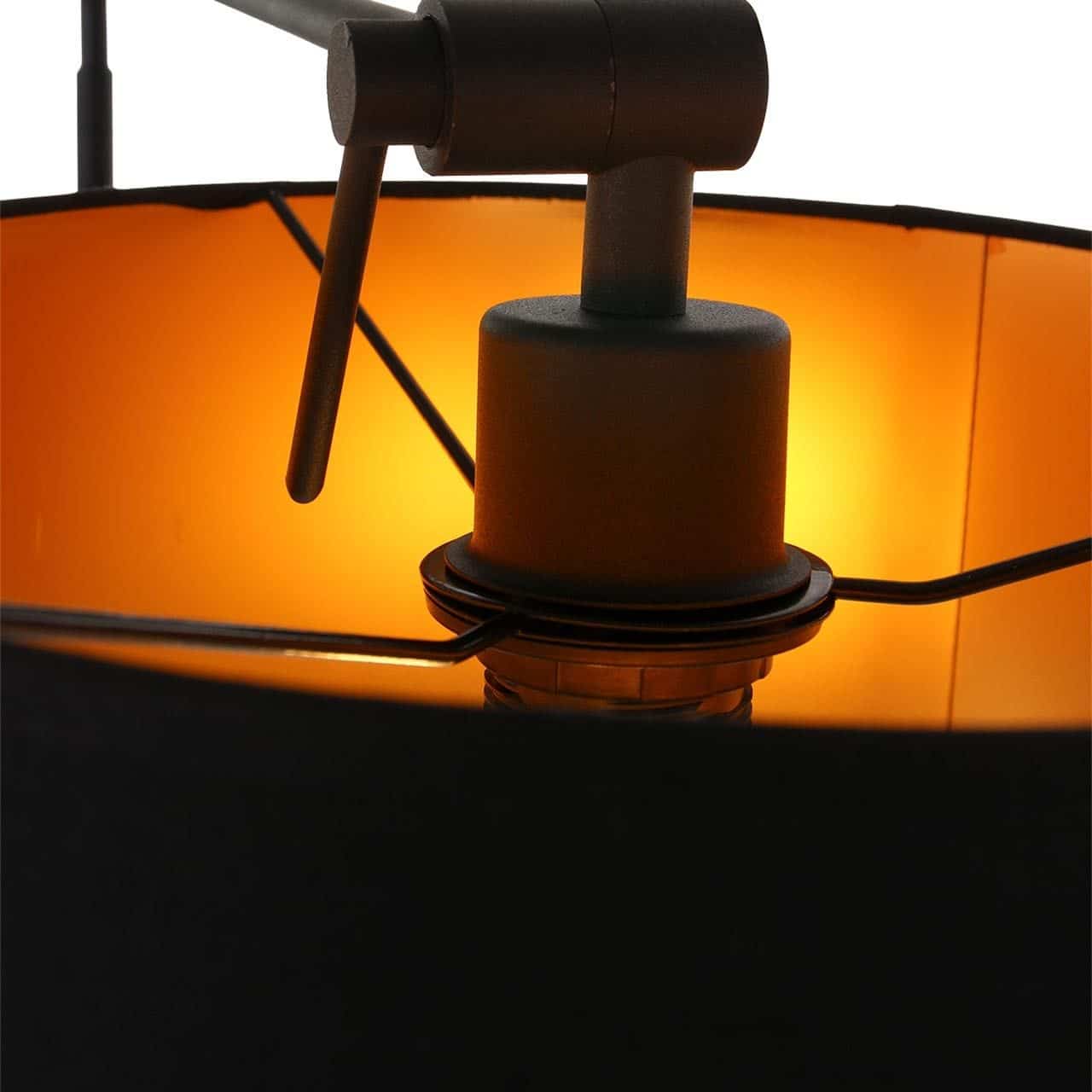 Wil jij jouw interieur een echte boost geven? Kies dan voor deze strakke en trendy staande lamp! Deze vloerlamp is uitgevoerd in een mat zwarte poedercoating. De kap (Ø 30 cm) van deze lamp heeft van binnen een warm gouden kleur, dit zorgt voor een leuk effect en een mooie licht verdeling. De hoogte van de lamp is verstelbaar van 140 tot 180 cm en de reikwijdte is 95 cm. Deze lamp staat super leuk naast de bank of een stoel, maar is ook functioneel. De kap is kantelbaar en de lamp is draaibaar zo kunt u er gemakkelijk een boek of tijdschrift onder lezen. Kijk even onderaan de pagina voor de bijpassende wandlamp. Gaat deze strakke lamp in uw winkelmandje?