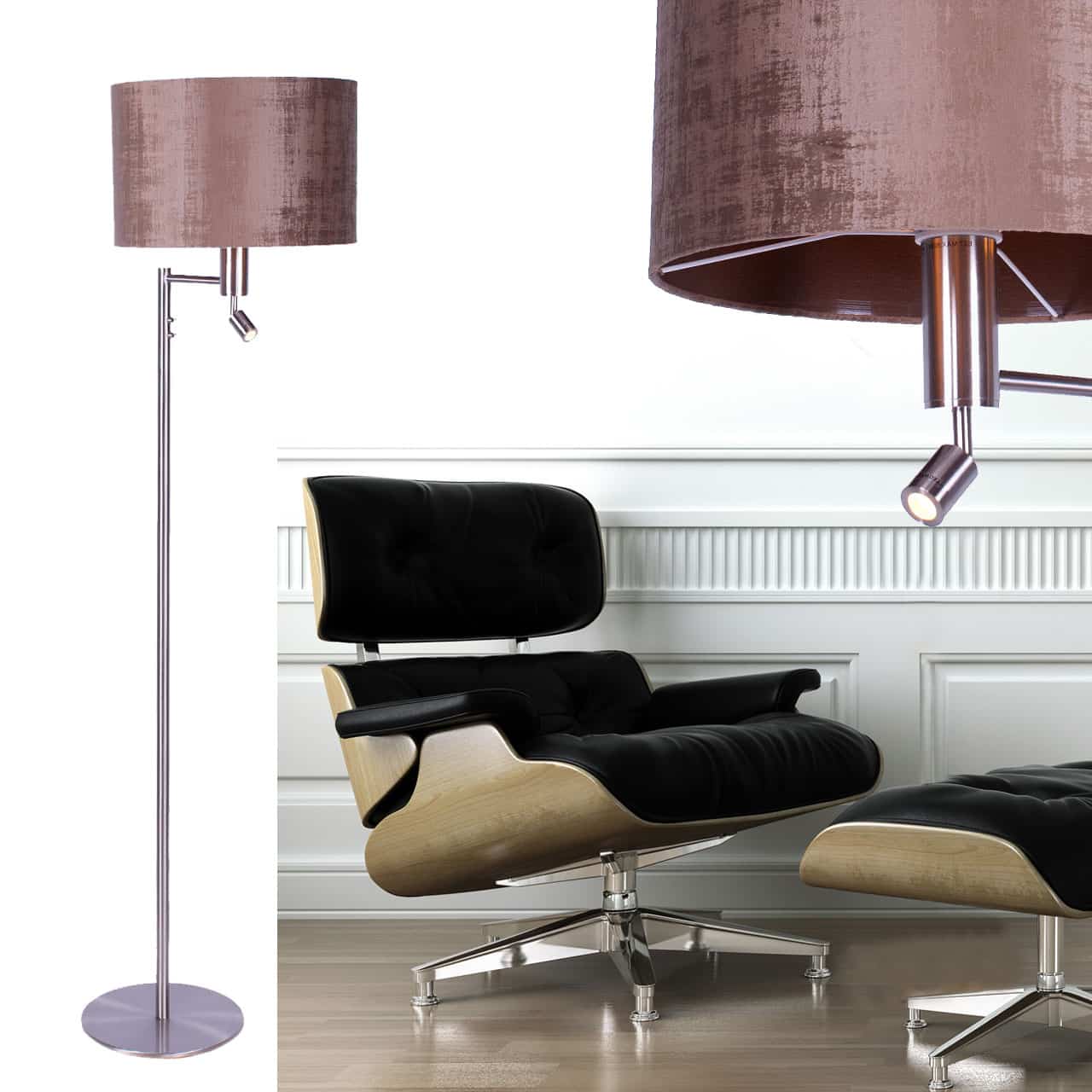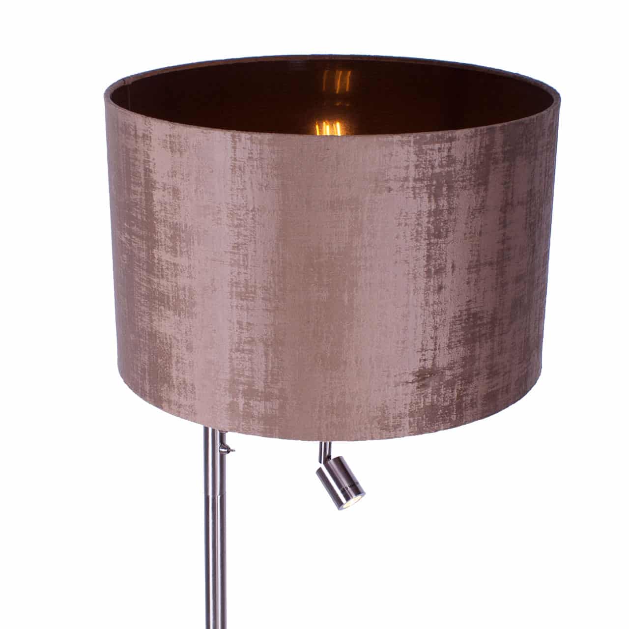 Hou je wel van een klassieke touch in je interieur? Dan is deze stalen vloerlamp met kap écht iets voor jou! Een praktische en decoratieve vloerlamp in één. Deze moderne vloerlamp is uitgerust met een brons kleurige velours kap met met een transparante binnenkant. Dit zorgt voor een prachtig lichteffect. Op het armatuur zitten twee aan- en uitschakelaars zodat je beide lampen apart kunt bedienen. Sfeer creëer je met de kap en lezen kun je makkelijk met de led spot, welke direct onder de kap zit.