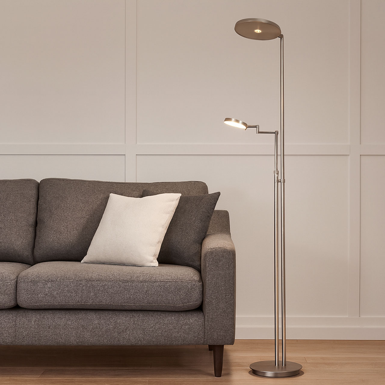 De Vienna Vloerlamp in staal / mat nikkel combineert strak design met moderne LED-techniek. Dankzij de dimbare uplighter, verstelbare leesarm en instelbare kleurtemperatuur creëer je altijd het perfecte licht – stijlvol én functioneel.