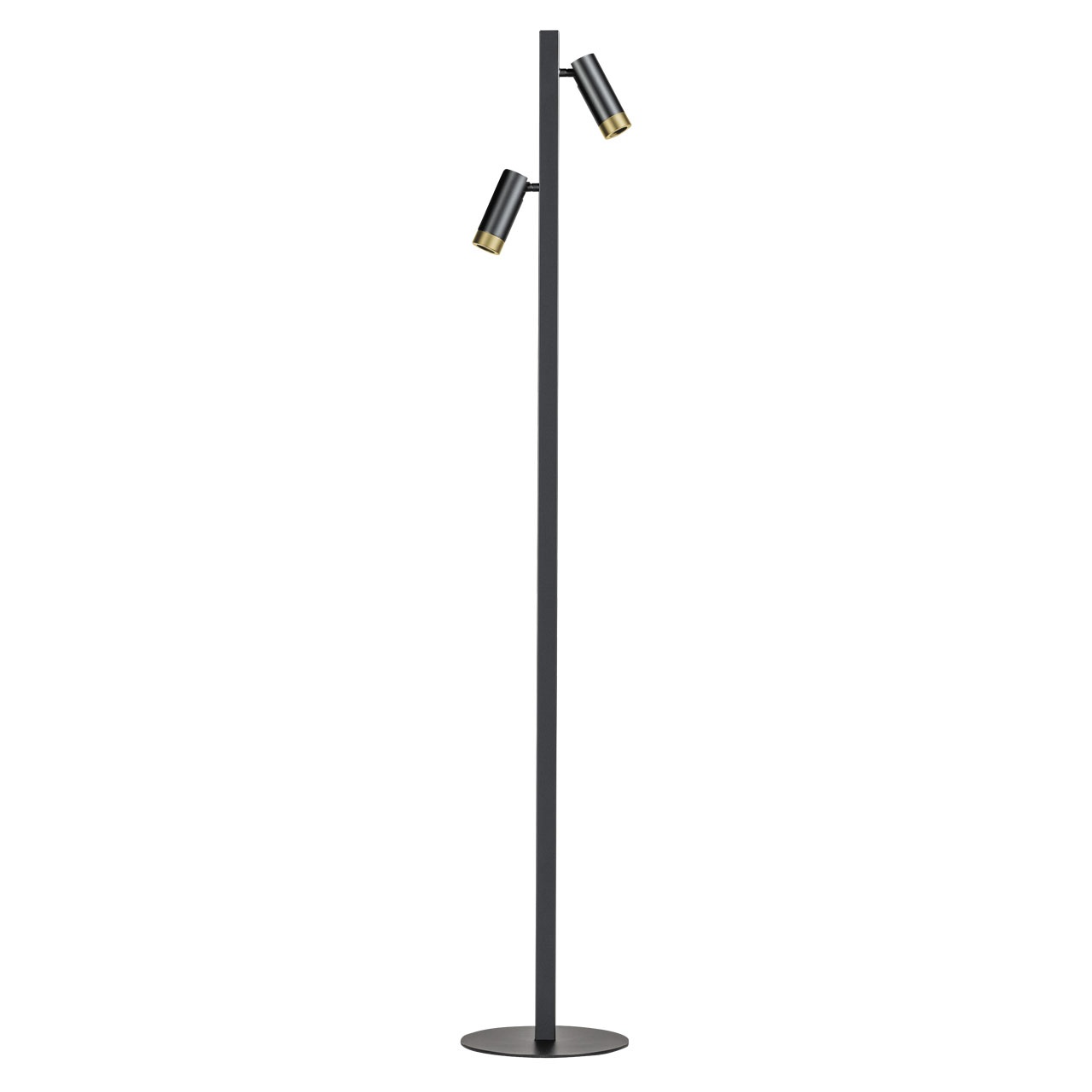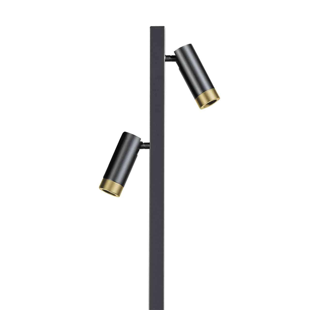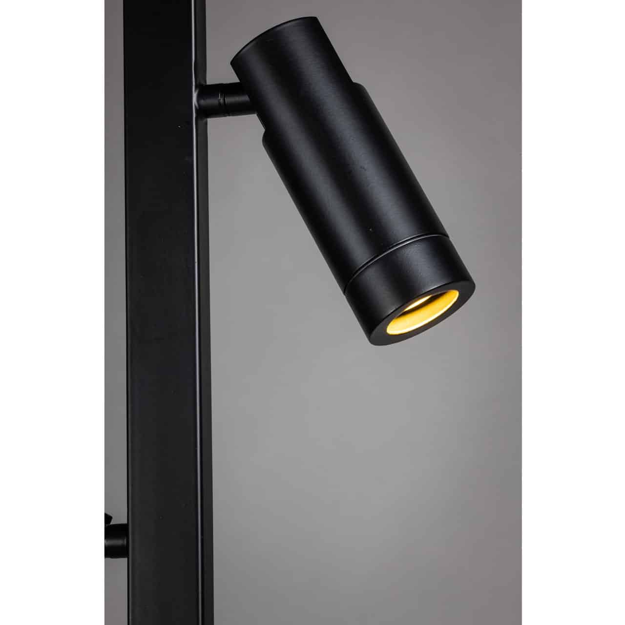 Deze moderne vloerlamp is een combinatie tussen stijl, functionaliteit en keuze. De lamp heeft een modern uiterlijk door het zwarte armatuur. Aan het uiteinde van de spots kan zowel een zwarte als een goudkleurige ring worden geplaatst. Van beide kleuren worden twee ringen meegeleverd, dus je kan na verloop van tijd de ringen weer omwisselen. Ook heb je nog de mogelijkheid om de ringen weg te laten en te kiezen voor een decoratieve ledlamp. De spots zijn draai- en kantelbaar, waardoor je de lamp goed kan gebruiken als leeslamp. Vanuit de voet loopt een zwart snoer van 175 cm met voetschakelaar.