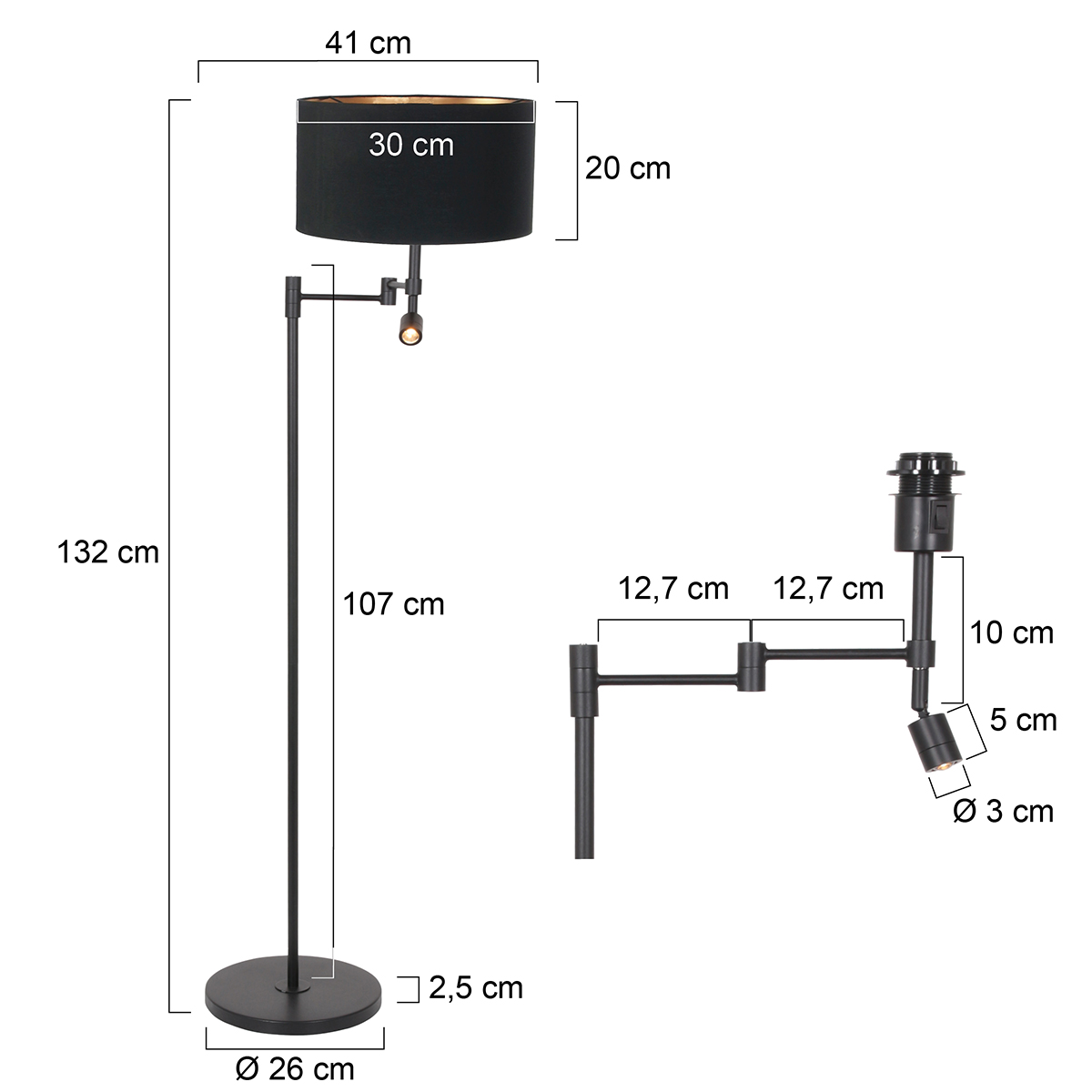 Ben jij op zoek naar een handige en stijlvolle vloerlamp? Dan zijn de leeslampen uit de serie Stang dé oplossing! Het strak vormgegeven frame is mat zwart. Er zit een draai- en kantelbaar leeslampje omlaag gericht. In deze leeslamp zit een 3W LED met wit licht. Op de top van de verticale stang zit de schakelaar van de leeslamp. Vlak onder de kap zit de schakelaar voor de lamp in de kap. Boven de leeslamp is de stoffen velours kap bevestigd. De buitenkant van de kap is zwart en de binnenkant is zilverkleurig. De kap heeft een diameter 30 cm en is 18 cm hoog. De lamp is inclusief kap 130 cm hoog en 41 cm diep. De lamp is draaibaar en richtbaar, maar is niet in hoogte te verstellen. De lamp wordt geleverd met een zwart snoer van 175 cm. Staat deze lamp binnenkort te schijnen in jouw interieur?
