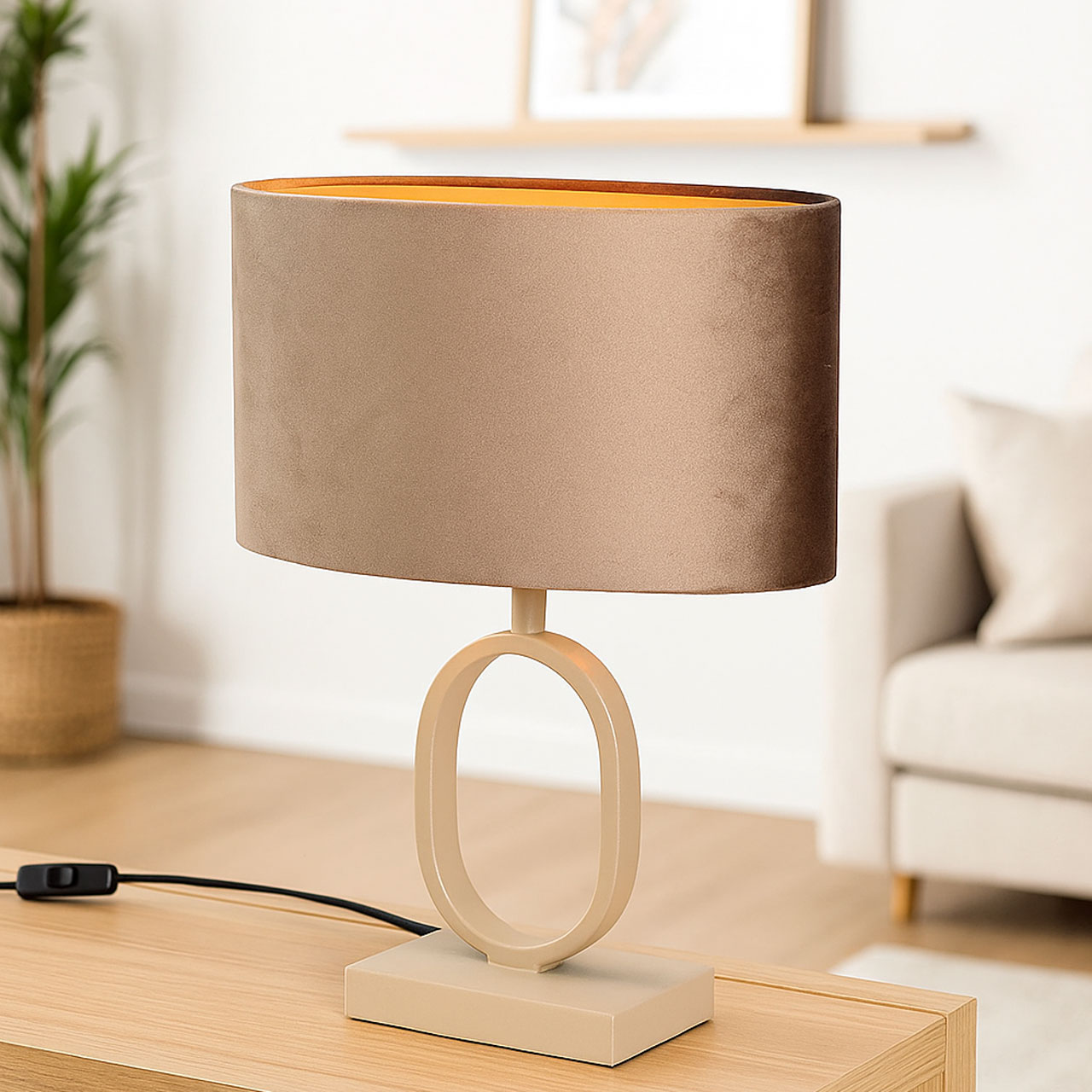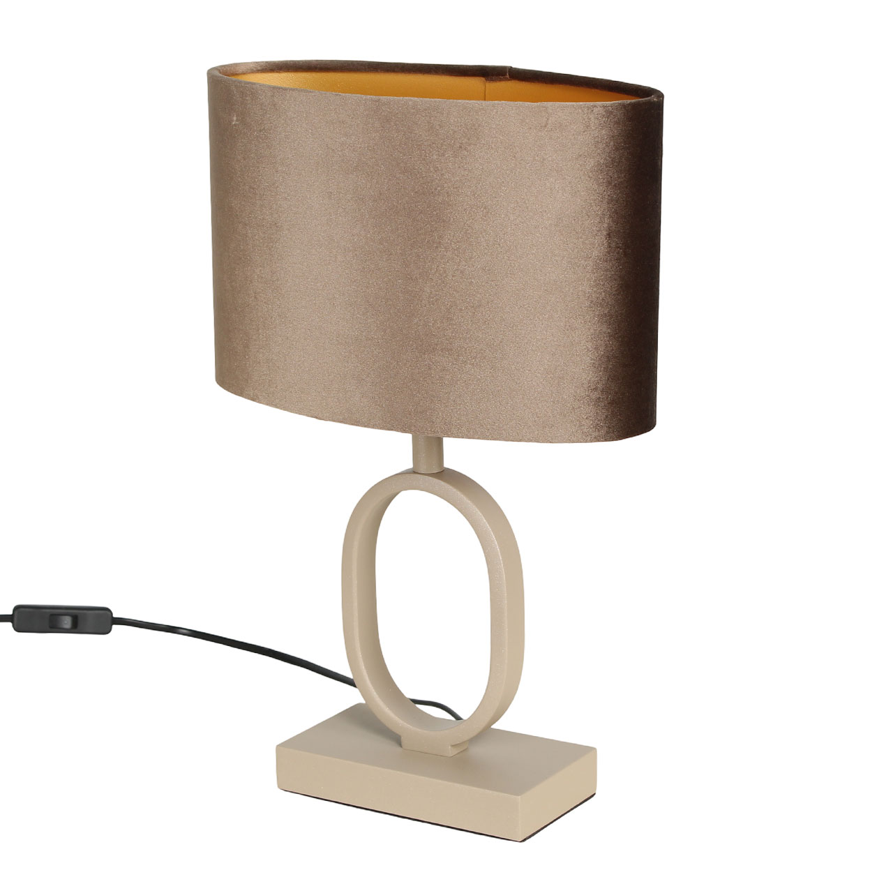 De lamp heeft een totale hoogte van 38 cm en een ovale kap van 25 cm breed, 13 cm diep en 16 cm hoog. Dankzij het compacte formaat is hij ideaal voor nachtkastjes, smalle plankjes, een vensterbank of bijzettafel. De beige/zandkleurige voet zorgt voor een rustige basis, terwijl de velvet kap voor luxe en warmte zorgt.