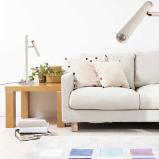 Deze staande leeslamp is verkrijgbaar in wit, zand/beige en zwart. Tevens ook leverbaar als tafellamp en één lichts model. Kijk voor de andere varianten hieronder.
