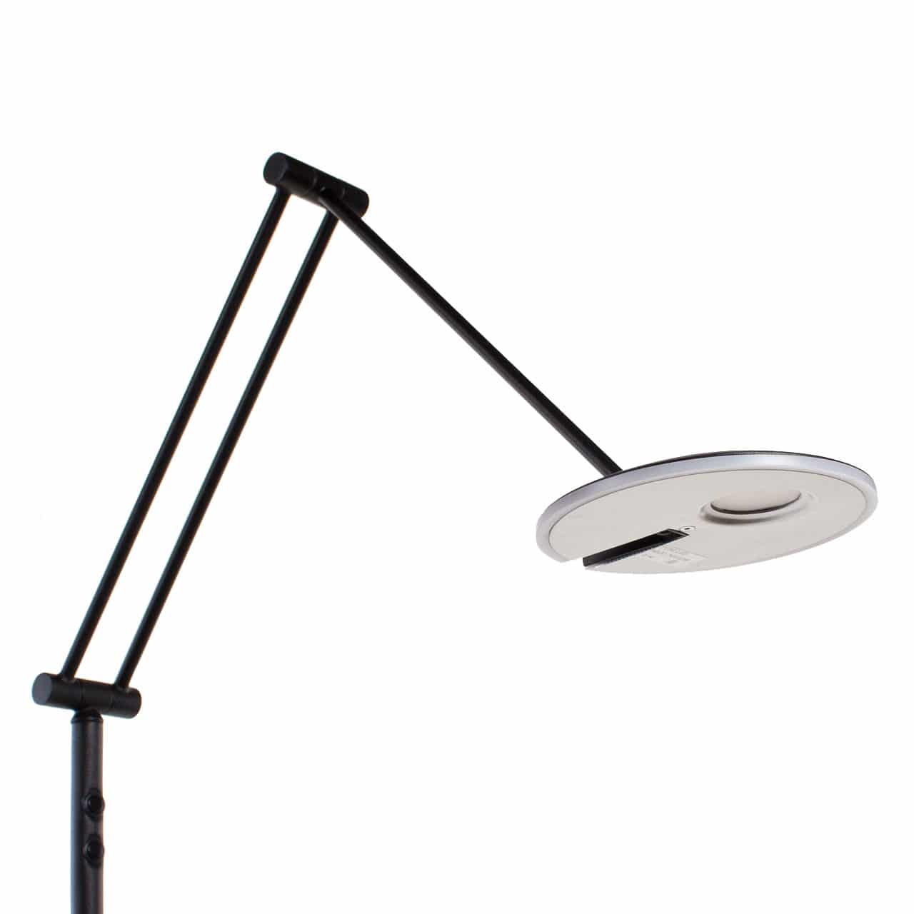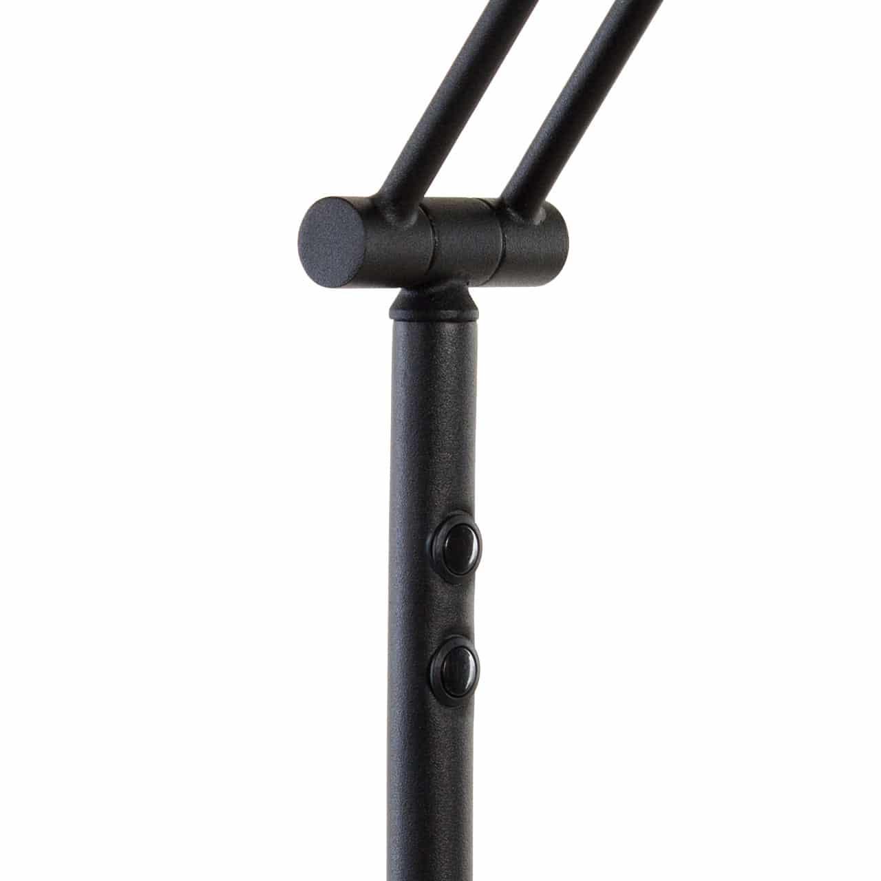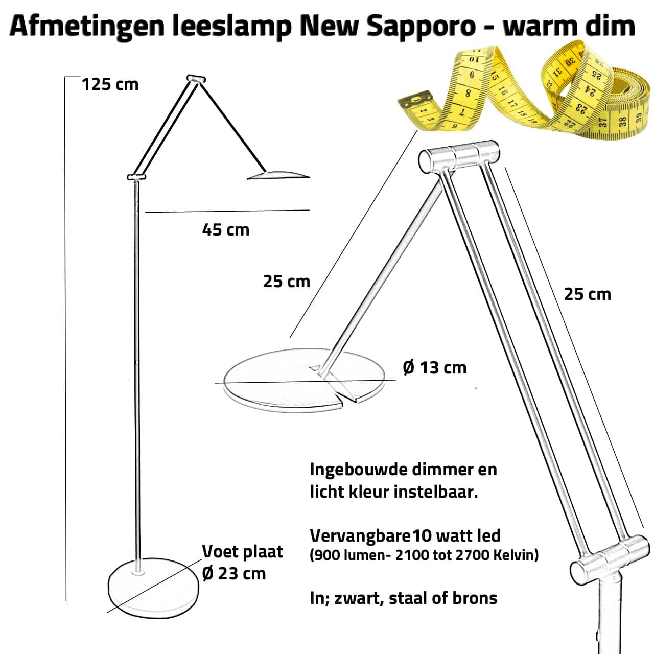 Stevige, praktische staande led leeslamp, behorend tot de Serie ‘Sapporo’ geborsteld staal. De ronde voet voet (23 cm), verticale stang zijn mat zwart gecoat. Aan het uiteinde van de draai, kantel en zwenkbare arm zit een ( 10 watt – 900 lumen) led (2100-2700 Kelvin). De led zit achter een kunstof plaatje (zie detailfoto’s) zodat er een mooi verlichte rand in het kapje zit.Op de verticale stang zit een drukdimmer zodat u de lamp makkelijk kunt bedienen. De dimmer heeft een geheugen functie. Dit betekent dat de leeslamp bij inschakeling in dezelfde lichtsterkte brand als waar deze in is uitgezet. Een staande leeslamp led welke zeer energiezuinig is terwijl deze zeer geschikt om te lezen.