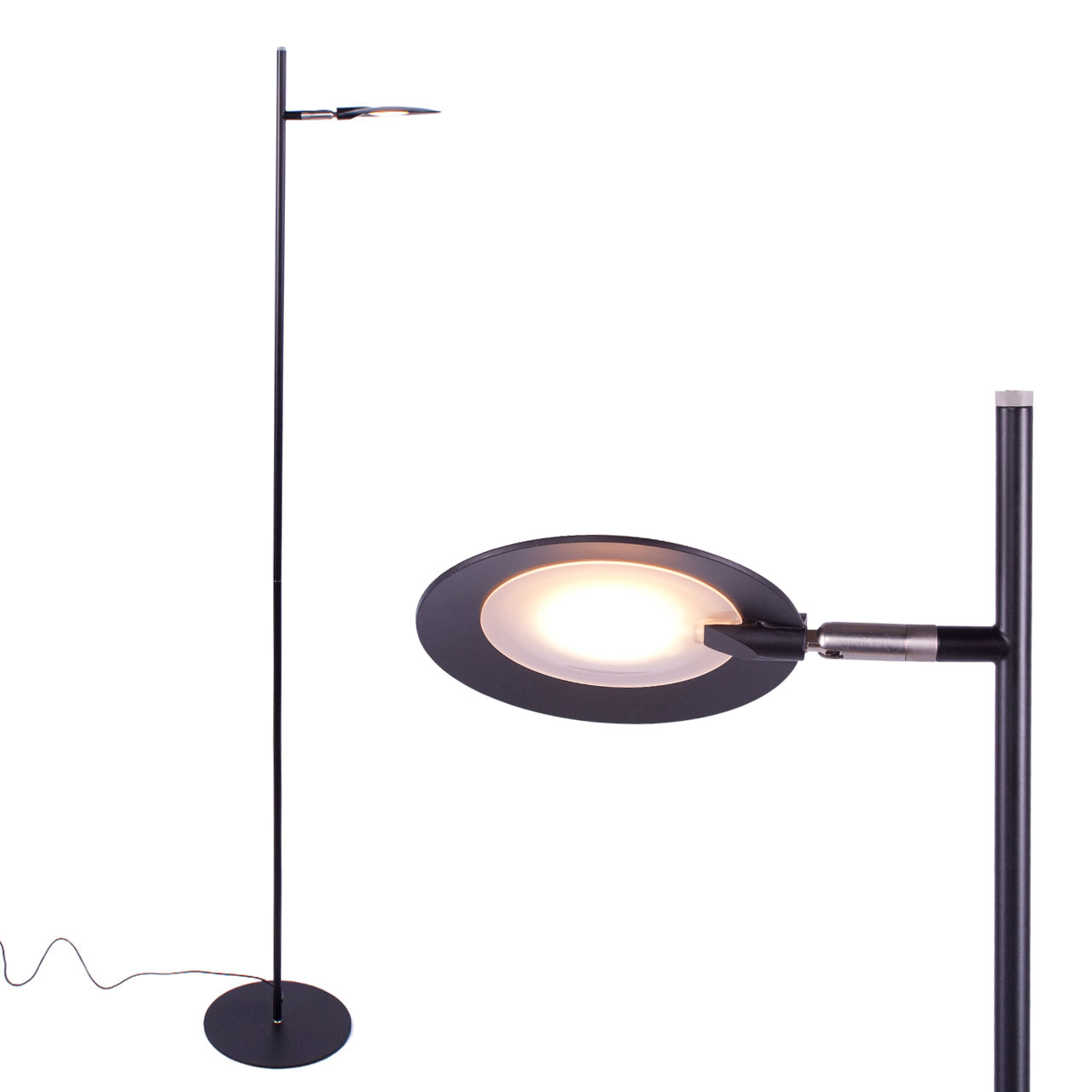 Deze staande leeslamp is verkrijgbaar in zwart en staal. Tevens ook verkrijgbaar in 2 lichts uitvoering. Kijk voor de andere varianten hieronder.