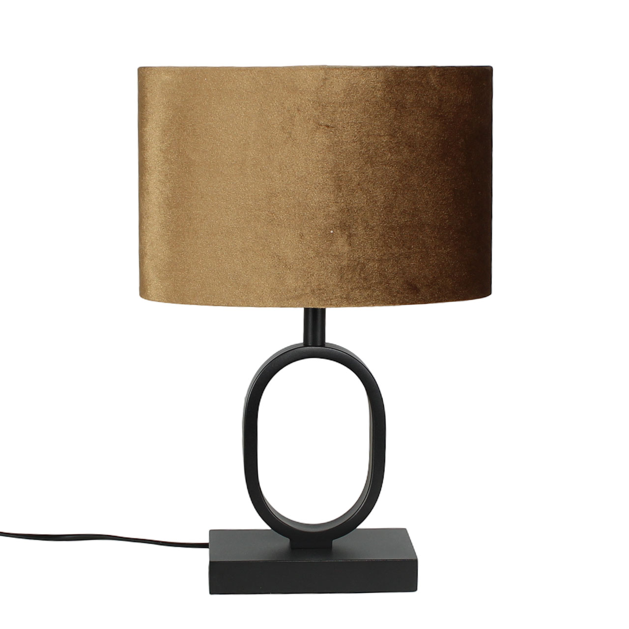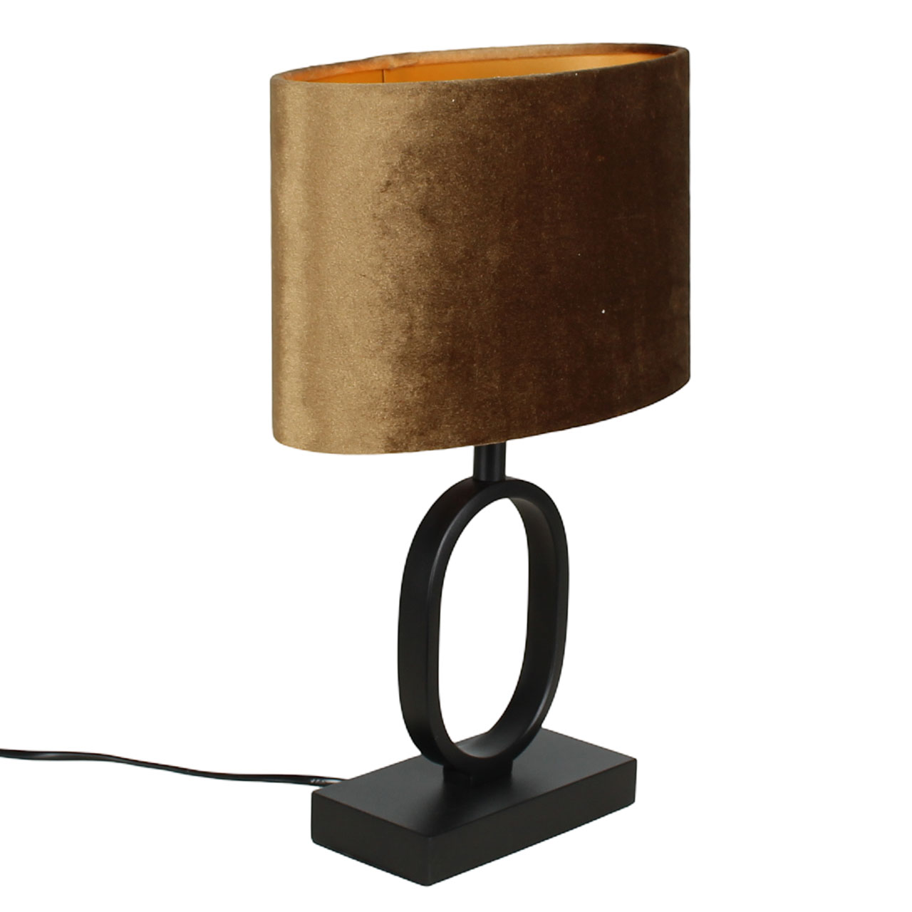 De lamp is 38 cm hoog en heeft een elegante ovale kap van 25 cm breed, 13 cm diep en 16 cm hoog. De diepe zwarte voet vormt een stijlvol contrast met de rijke, koffiebruine kap met gouden binnenzijde. Een ideale keuze voor nachtkastjes, dressoirs of als sfeervolle tafellamp in de woonkamer.
