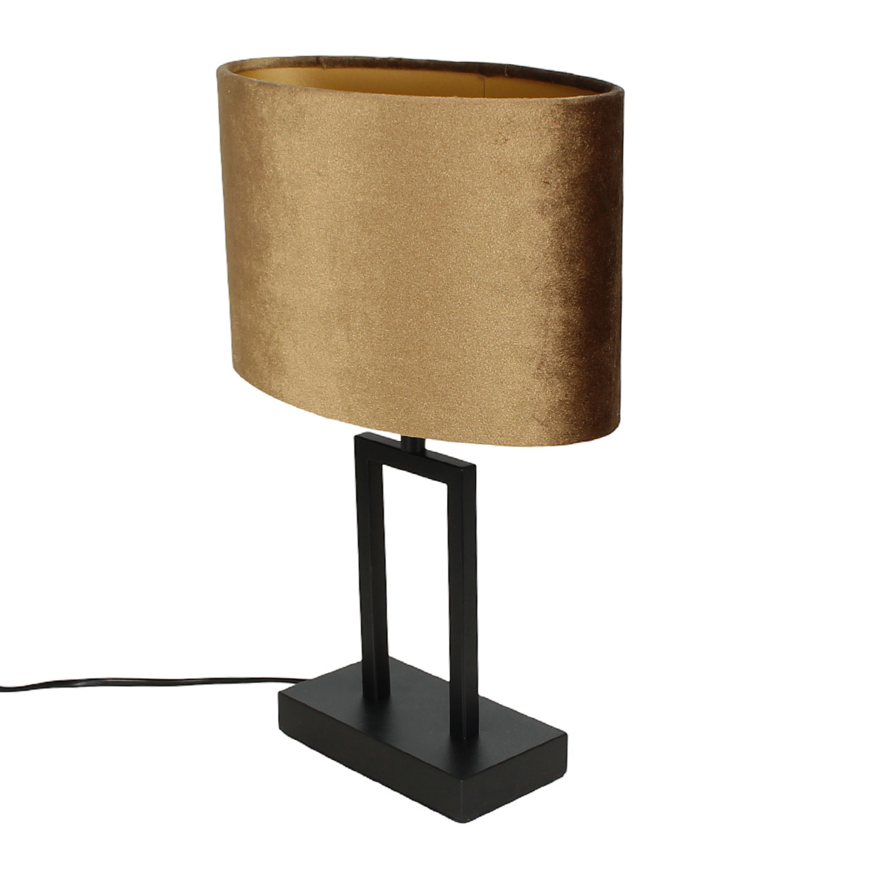 De lamp heeft een totale hoogte van 38 cm en is voorzien van een ovale kap van 25 cm breed, 13 cm diep en 16 cm hoog. De fluweelzachte velvet kap in aardetint aan de buitenzijde en een gouden binnenkant zorgt voor een warme, sfeervolle lichtval. De zwarte, geometrische voet geeft een modern contrast en maakt deze lamp tijdloos én veelzijdig inzetbaar.
